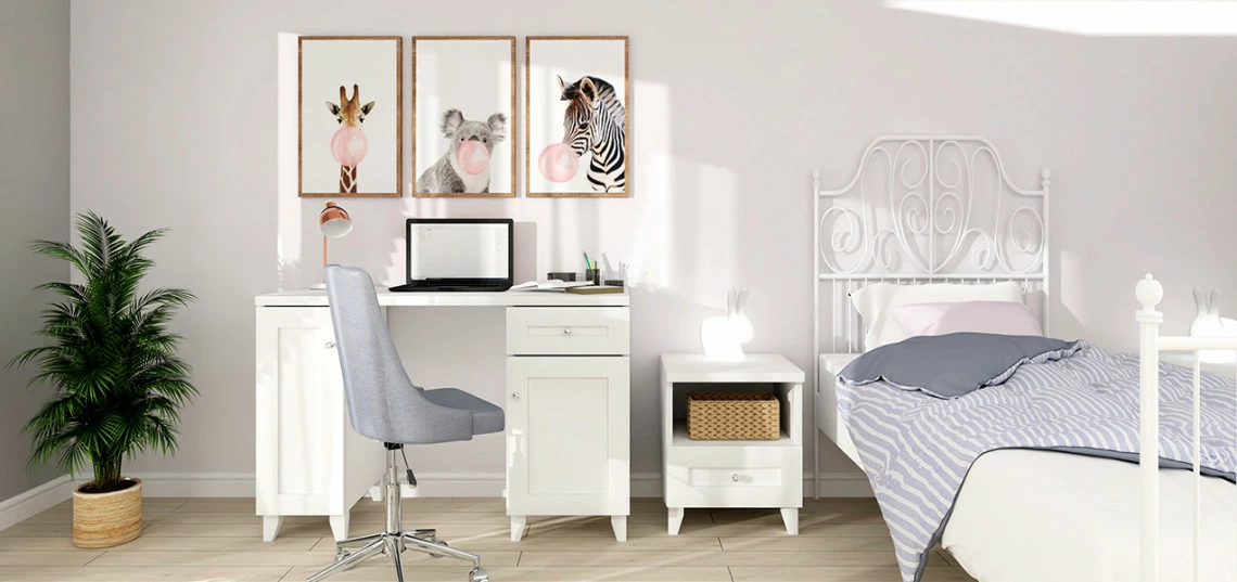 Proste biurko komputerowe zmieści się w niewielkim wnętrzu. Można na nim ustawić monitor lub laptop. Na dolnej półce zmieści się baza danych, a w niewielkiej półce pod blatem można przechować ryzę papieru, skoroszyt i długopis. Minimalistyczny design pasuje do każdej aranżacji. Bogata gama kolorystyczna umożliwia dopasowanie mebla do konkretnej stylizacji. Jeśli w dysponujemy wolnym miejsce, warto dokupić do niego kontenerek w tym samym kolorze.