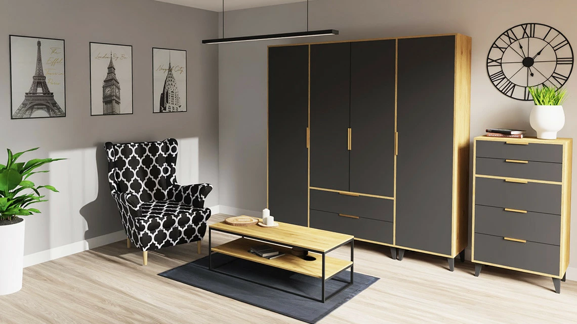 W ofercie są dostępne m.in. szafy z półkami i drążkiem, regały, stoliki rtv czy półki. Z ich pomocą stworzymy funkcjonalną strefę rozrywki. To ciekawa propozycja również dla osób, które zdecydują się połączyć salon z sypialnią.