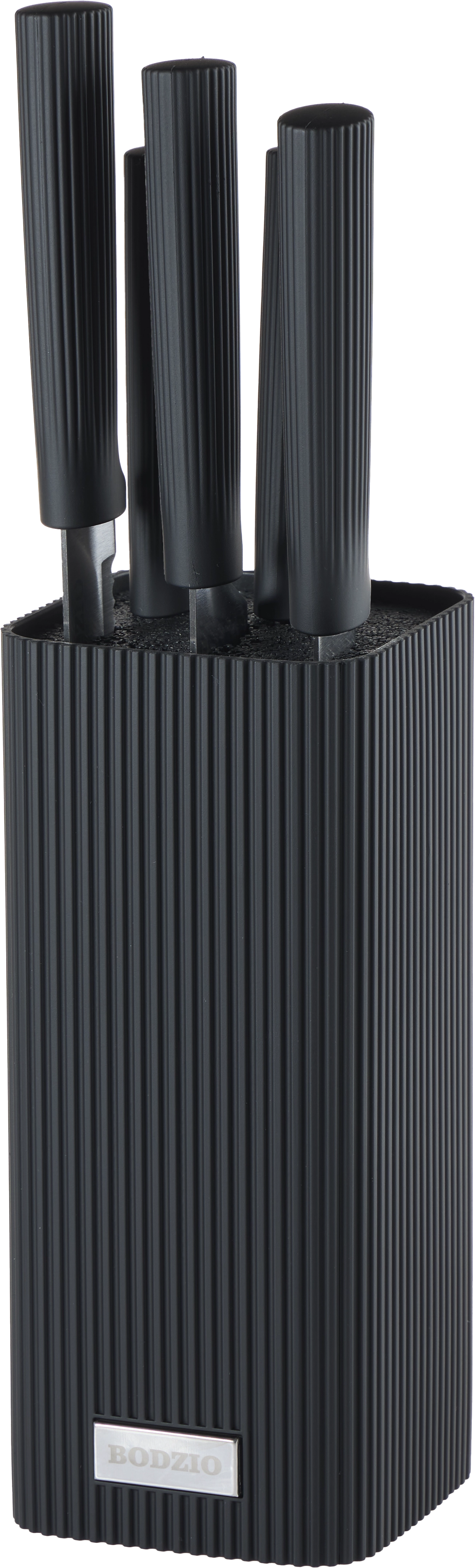 Zestaw noży w bloku RIFLE 16 w kolorze czarnym to nowoczesny i elegancki komplet, idealny do każdej kuchni. Składa się z 6 elementów, które doskonale sprawdzą się przy codziennym przygotowywaniu posiłków – od krojenia warzyw po porcjowanie mięsa. Noże przechowywane są w stylowym, czarnym bloku, który zapewnia wygodne i bezpieczne przechowywanie, a jednocześnie stanowi designerski akcent na kuchennym blacie. Minimalistyczna forma i uniwersalna kolorystyka sprawiają, że zestaw świetnie pasuje do nowoczesnych aranżacji.