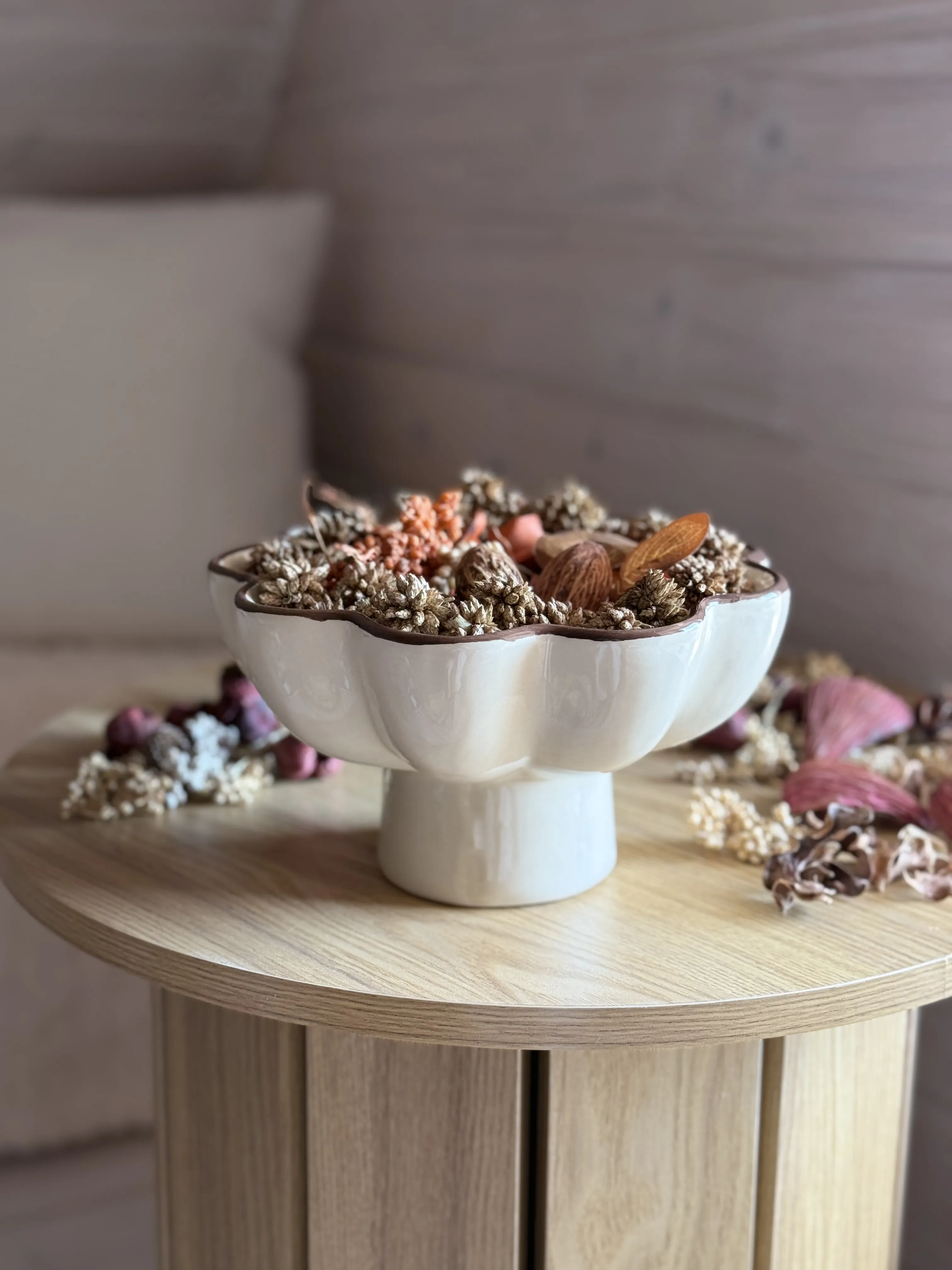 Miska dekoracyjna AUTUMN 27 w kolorze beżowo-brązowym to elegancki i funkcjonalny element jesiennej aranżacji wnętrza. Wykonana z dolomitu, łączy trwałość z dekoracyjnym wyglądem. Wymiary 20x20x11,5 cm sprawiają, że świetnie sprawdzi się jako ozdobne naczynie na drobiazgi, suszone liście lub inne sezonowe akcenty. Naturalna kolorystyka podkreśla ciepły i przytulny charakter przestrzeni, idealna do salonu, jadalni lub przedpokoju.