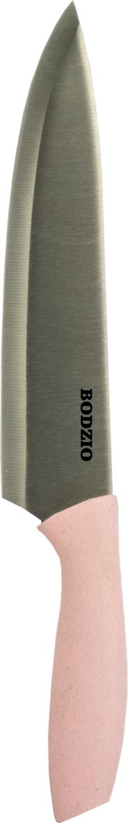 Nóż szefa kuchni wykonany ze stali nierdzewnej, z plastikową rączką wykończoną naturalną słomą w kolorze różowym. Posiada grubość stali wynoszącą 1,8 mm, co zapewnia trwałość i precyzję cięcia. Idealny do różnorodnych prac w kuchni, łączący funkcjonalność z estetycznym designem.