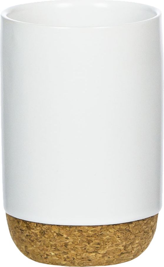 Funkcjonalny, ceramiczny, biały kubek z korkowym spodem z kolekcji Perlona do zastosowań w łazience.