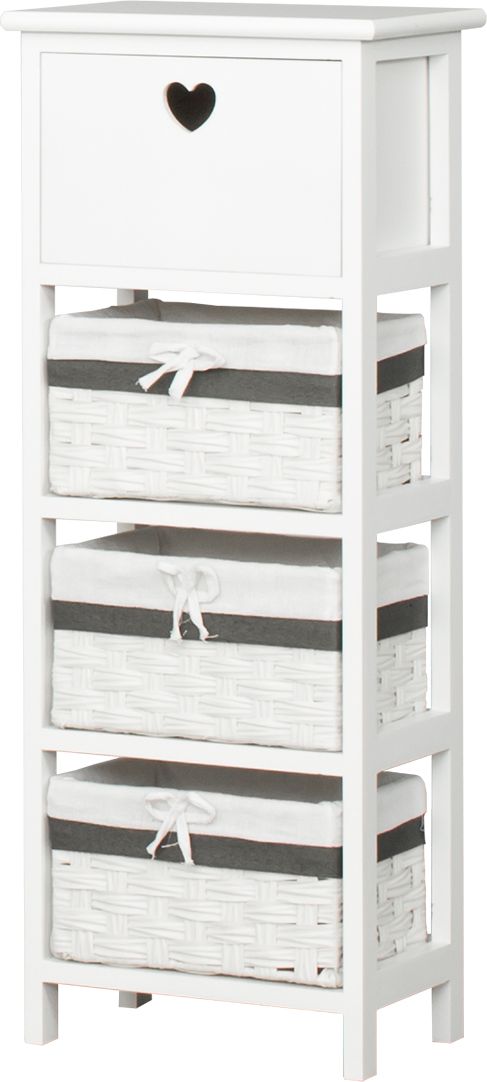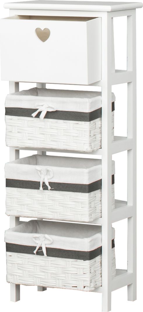 Szafka łazienkowa Skandina w kolorze białym, wykonana w skandynawskim stylu. Idealnie dopasuje się do nowoczesnej łazienki jak i utrzymanej w tradycyjnym klimacie. Szuflada oraz trzy kosze wiklinowe pozwolą na przechowanie najpotrzebniejszych drobiazgów.