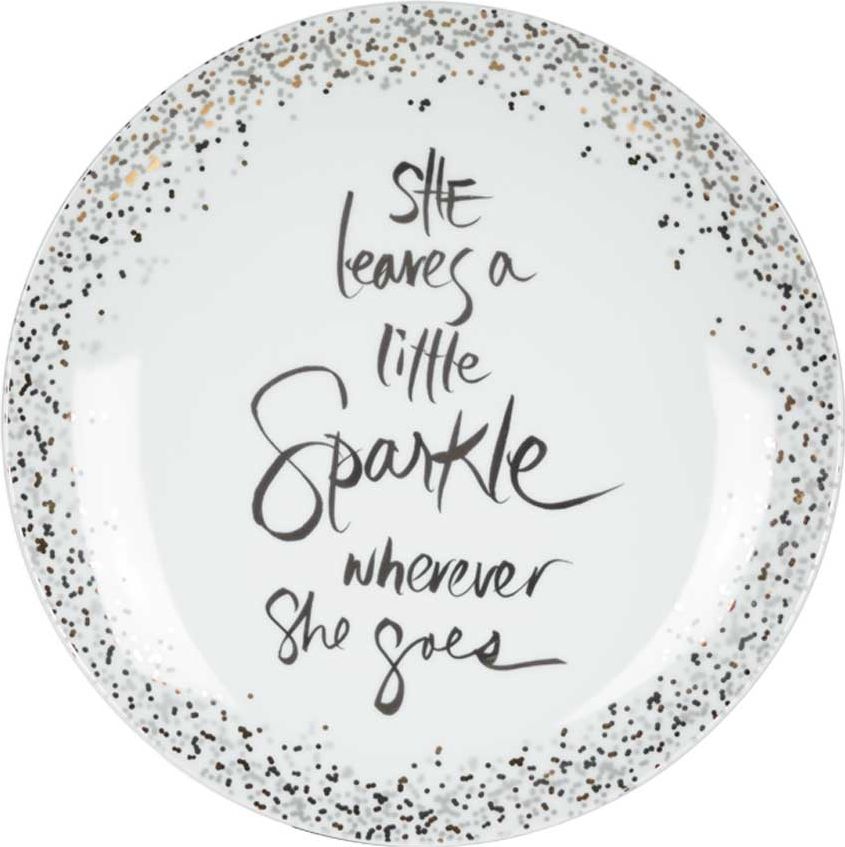 Talerz z motywem bożonarodzeniowym w kolorze biało-złotym. Wzór brokatowy, błyszczący.