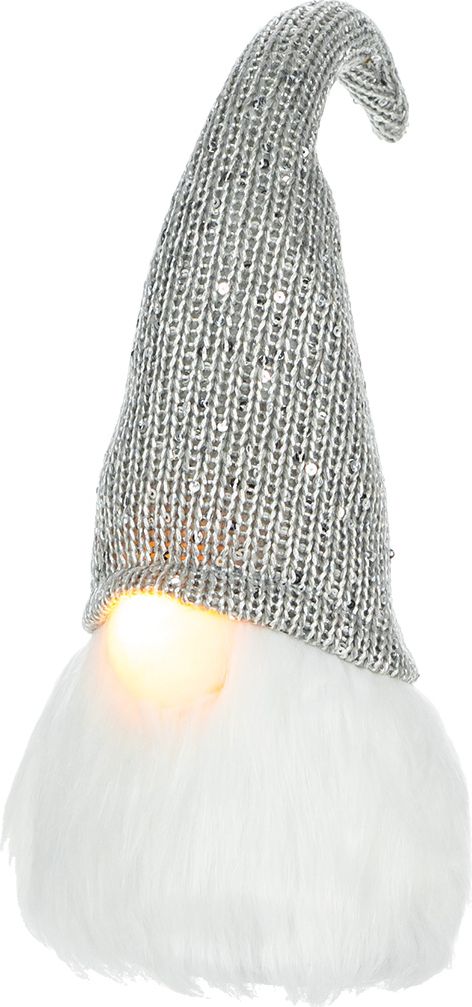 Gnom ze świecącym noskiem LED świetnie sprawdzi się jako dekoracja na parapecie, komodzie, podłodze lub obok choinki. Jest to subtelna dekoracja dodająca świąteczny klimat wnętrzu. Zasilany na dwie baterie typu AAA.