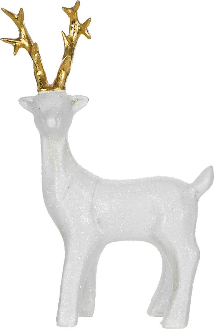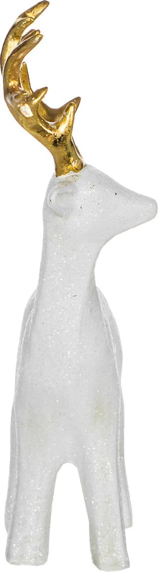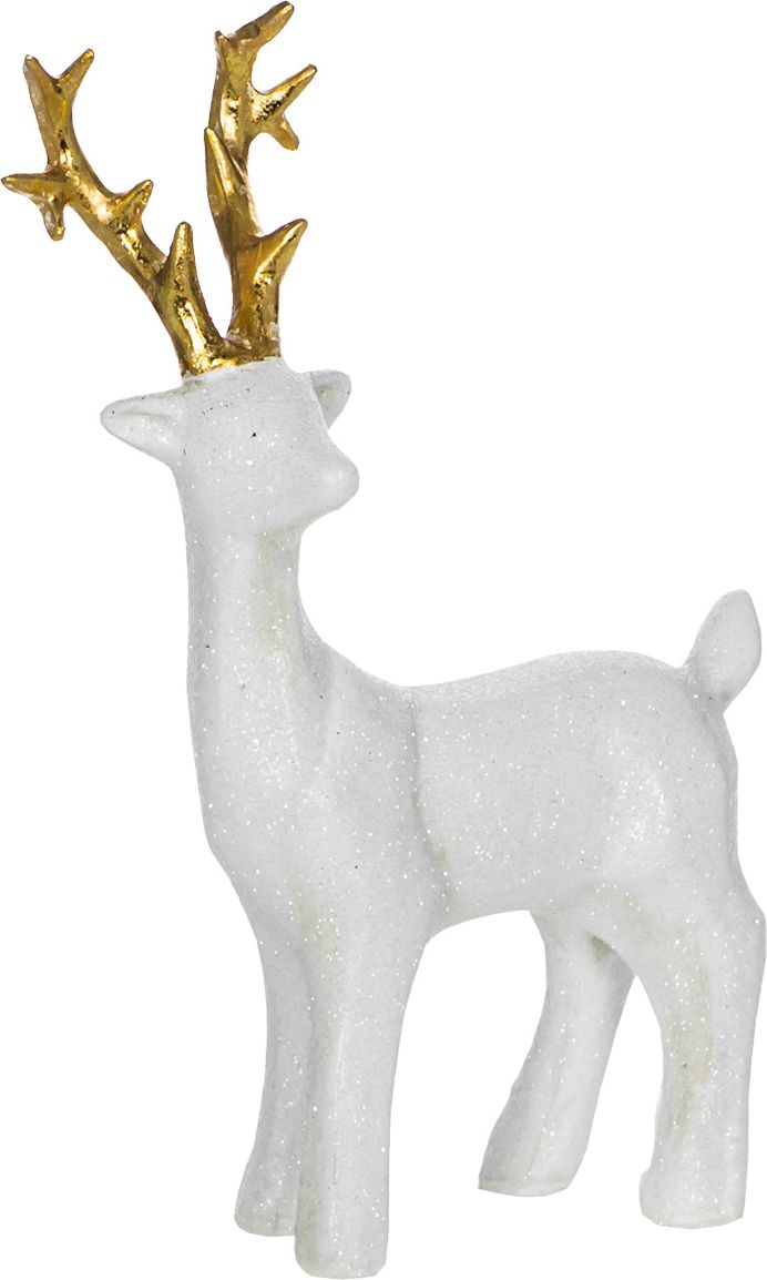 Biała zimowa figurka renifer JOLIA ze złotym zdobionym porożem to doskonała dekoracja świątecznego stołu, komody, a także witryny.Renifer doskonale wkomponuje się w każde wnętrze w różnych stylach, będzie również wspaniałym prezentem dla bliskich.