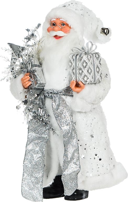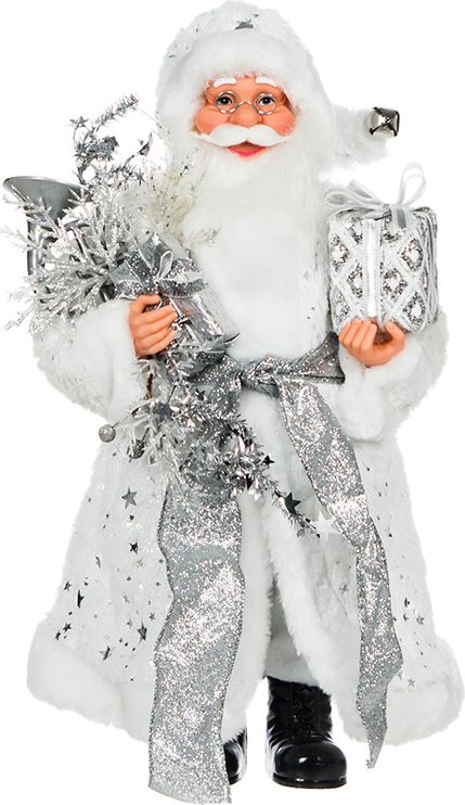 Figurka Mikołaja w charakterystycznym, srebrnym stroju uatrakcyjni bożonarodzeniową aranżację wnętrza.
