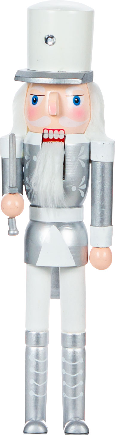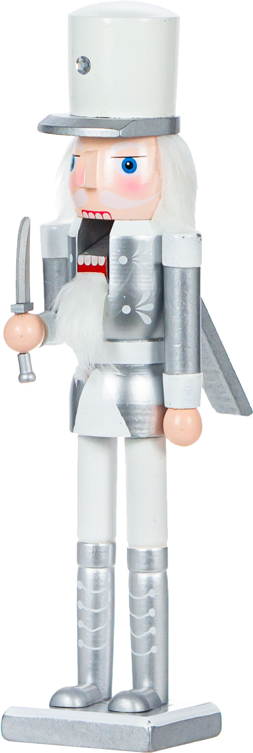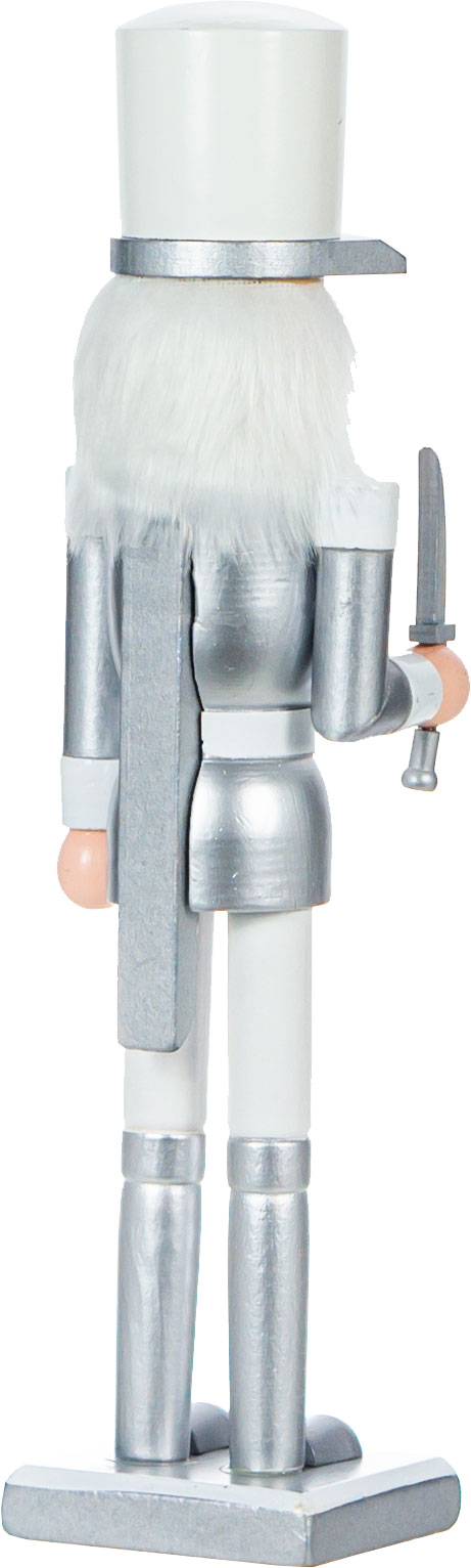 Stylowy Dziadek do Orzechów w biało-srebrnej kolorystyce – elegancka ozdoba świąteczna, której srebrne detale nadają blasku, idealnie współgrając z klasyczną bielą. Subtelny i elegancki akcent na święta.