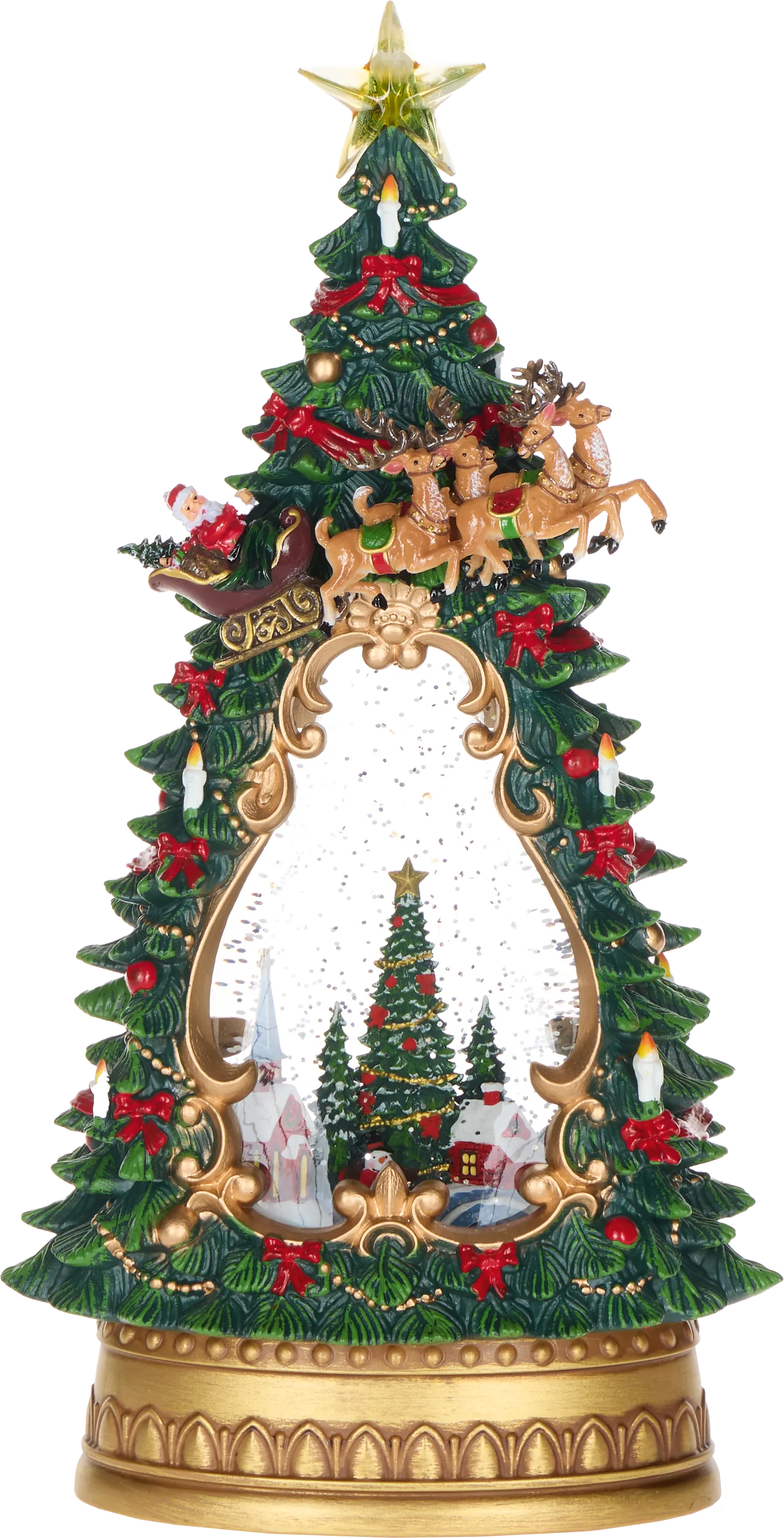 Ozdoba bożonarodzeniowa CHRISTMAS LIGHT 215 to efektowna kula śnieżna z choinką, wyposażona w oświetlenie LED. Połączenie kolorów zielonego, czerwonego i złotego nadaje jej klasyczny, świąteczny charakter. Subtelne światło tworzy przytulną atmosferę i pięknie podkreśla detale dekoracji. Idealna do ustawienia na komodzie, parapecie lub stole, gdzie stanie się wyjątkowym akcentem bożonarodzeniowego wystroju. Wymiary: 17,8x10,2x35 cm.