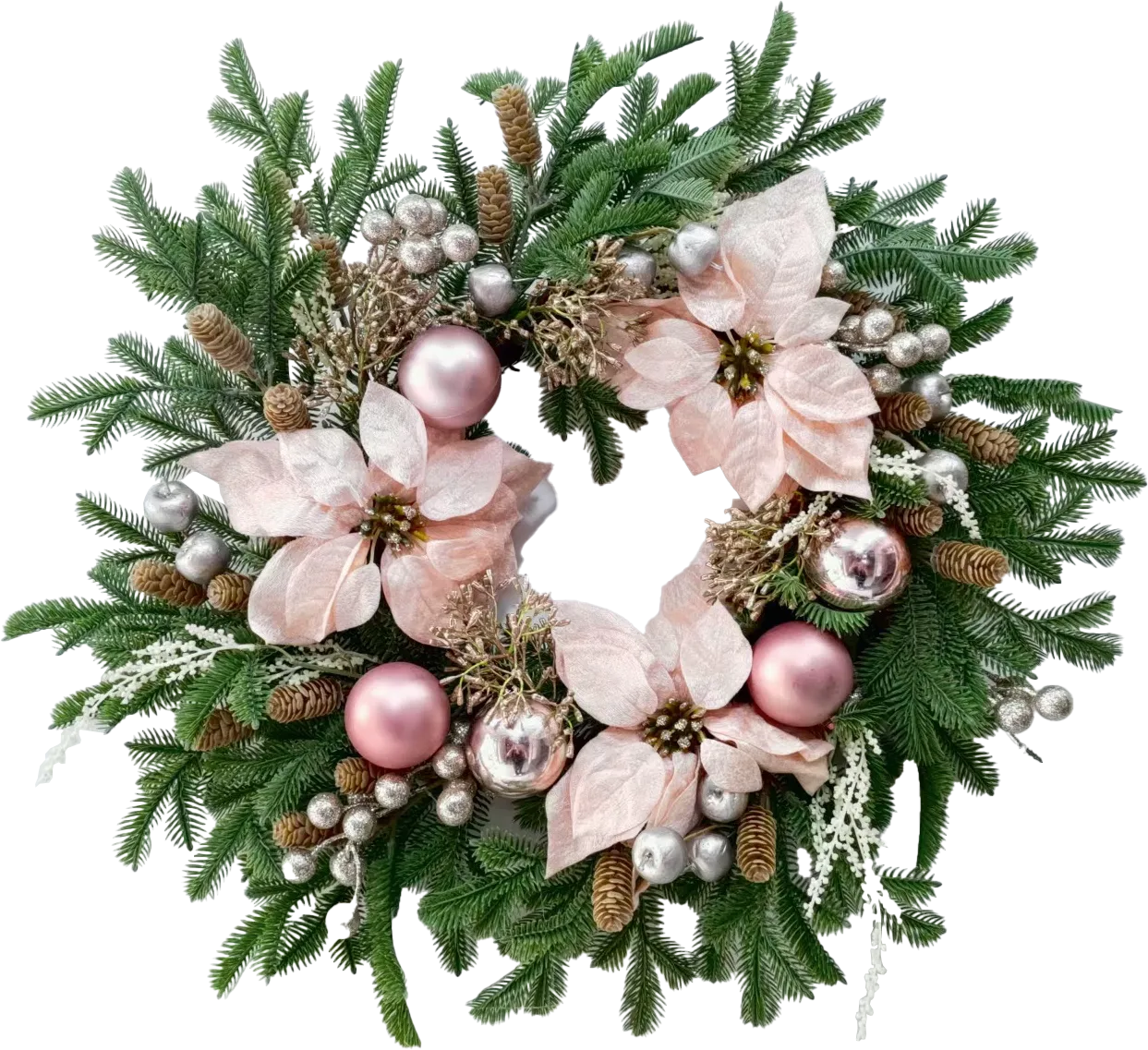 Dekoracja bożonarodzeniowa – wieniec MERRY CHRISTMAS 1 to elegancki, okrągły wieniec w kolorach zielonym i jasnoróżowym. Subtelne, pastelowe akcenty nadają mu nowoczesny i delikatny charakter, idealnie wpasowujący się w świąteczne aranżacje. Doskonale sprawdzi się jako ozdoba drzwi, ściany lub stołu, wprowadzając do wnętrza przytulny, bożonarodzeniowy klimat. Średnica: 55 cm.