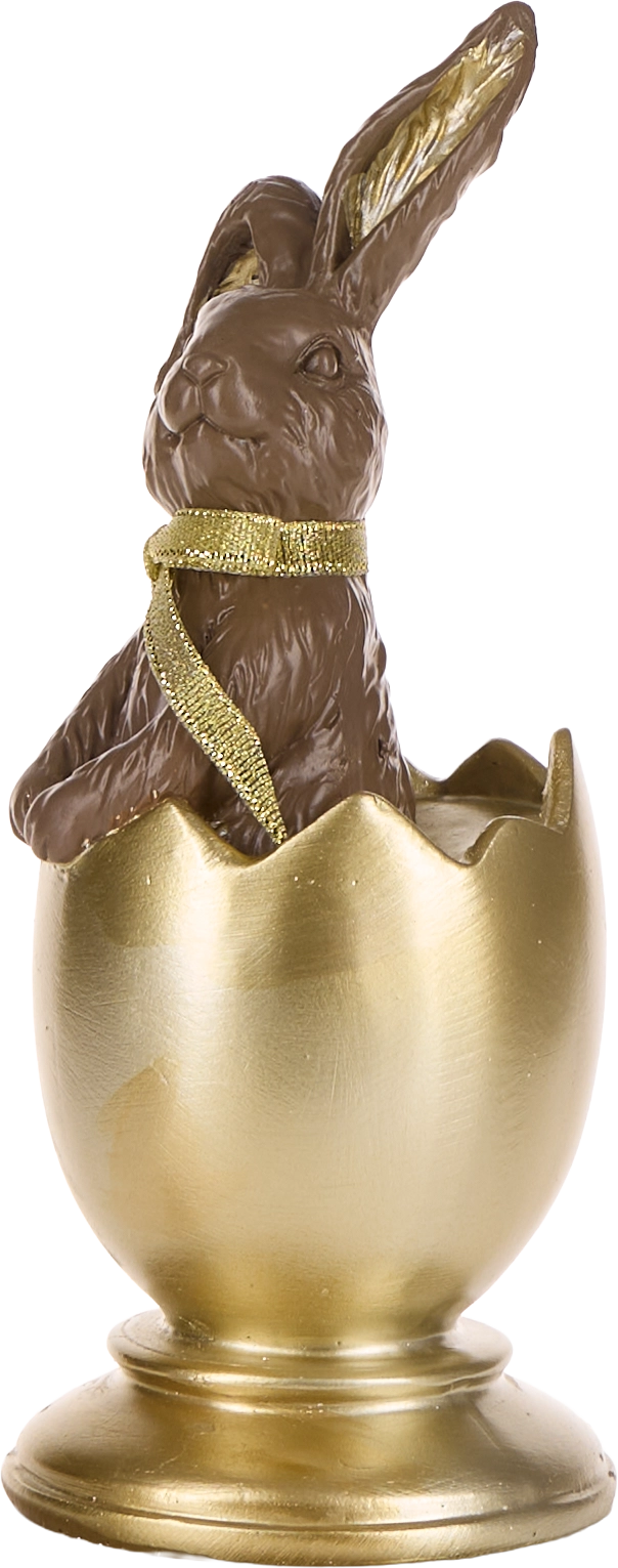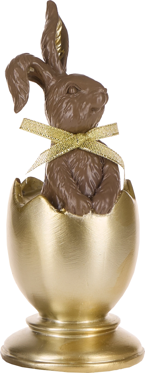 Ozdoba wielkanocna "CHOCOLATE EASTER"-42 przedstawiająca królika w jajku, wykonana z żywicy, to elegancki i wyjątkowy element świątecznej dekoracji. Kolorystyka brązowego czekoladowego i złotego nadaje jej luksusowy i stylowy charakter. Wymiary 7,5 x 7,5 x 19 cm sprawiają, że doskonale prezentuje się na stole, komodzie lub półce, wprowadzając ciepły, wielkanocny akcent do wnętrza. Idealna do klasycznych i nowoczesnych aranżacji.
