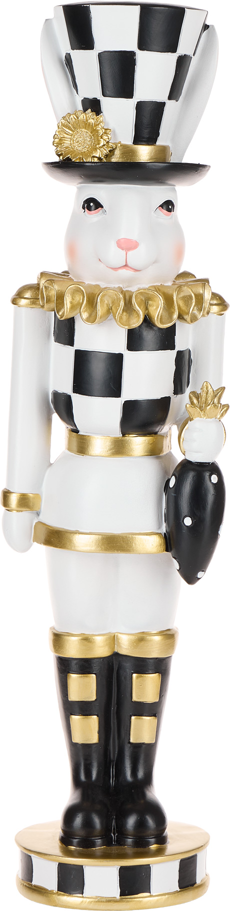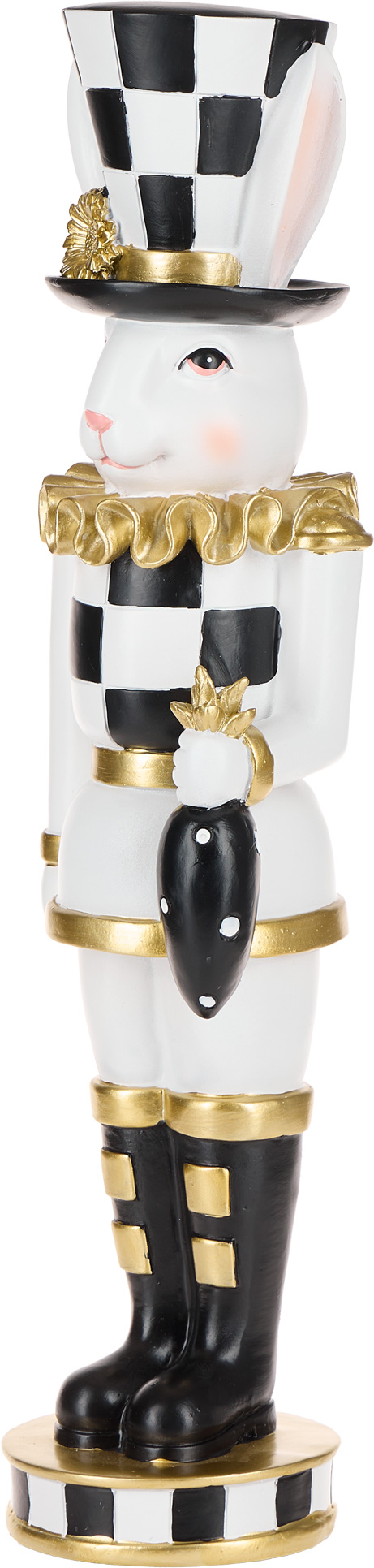 Ozdoba wielkanocna "BLACK AND WHITE EASTER"-49 w kształcie królika wykonana z żywicy to elegancki i stylowy dodatek do świątecznej dekoracji. Połączenie kolorów białego, czarnego i złotego nadaje jej nowoczesny i wyrafinowany charakter. Jej wymiary 12 x 10 x 46 cm sprawiają, że doskonale prezentuje się na stole, komodzie lub półce, wprowadzając wyjątkowy, świąteczny klimat do wnętrza.