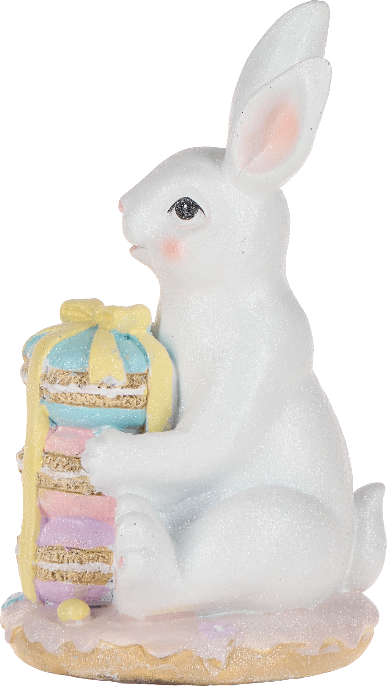 Ozdoba wielkanocna "PASTEL EASTER"-53 przedstawiająca królika z makaronikami, wykonana z żywicy poliestrowej, to uroczy i stylowy element świątecznej dekoracji. Wymiary 16,5 x 15 x 27,5 cm sprawiają, że doskonale prezentuje się na stole, komodzie lub półce. Delikatna pastelowa kolorystyka nadaje jej ciepły i elegancki charakter, idealnie komponując się zarówno z klasycznymi, jak i nowoczesnymi aranżacjami wnętrz.