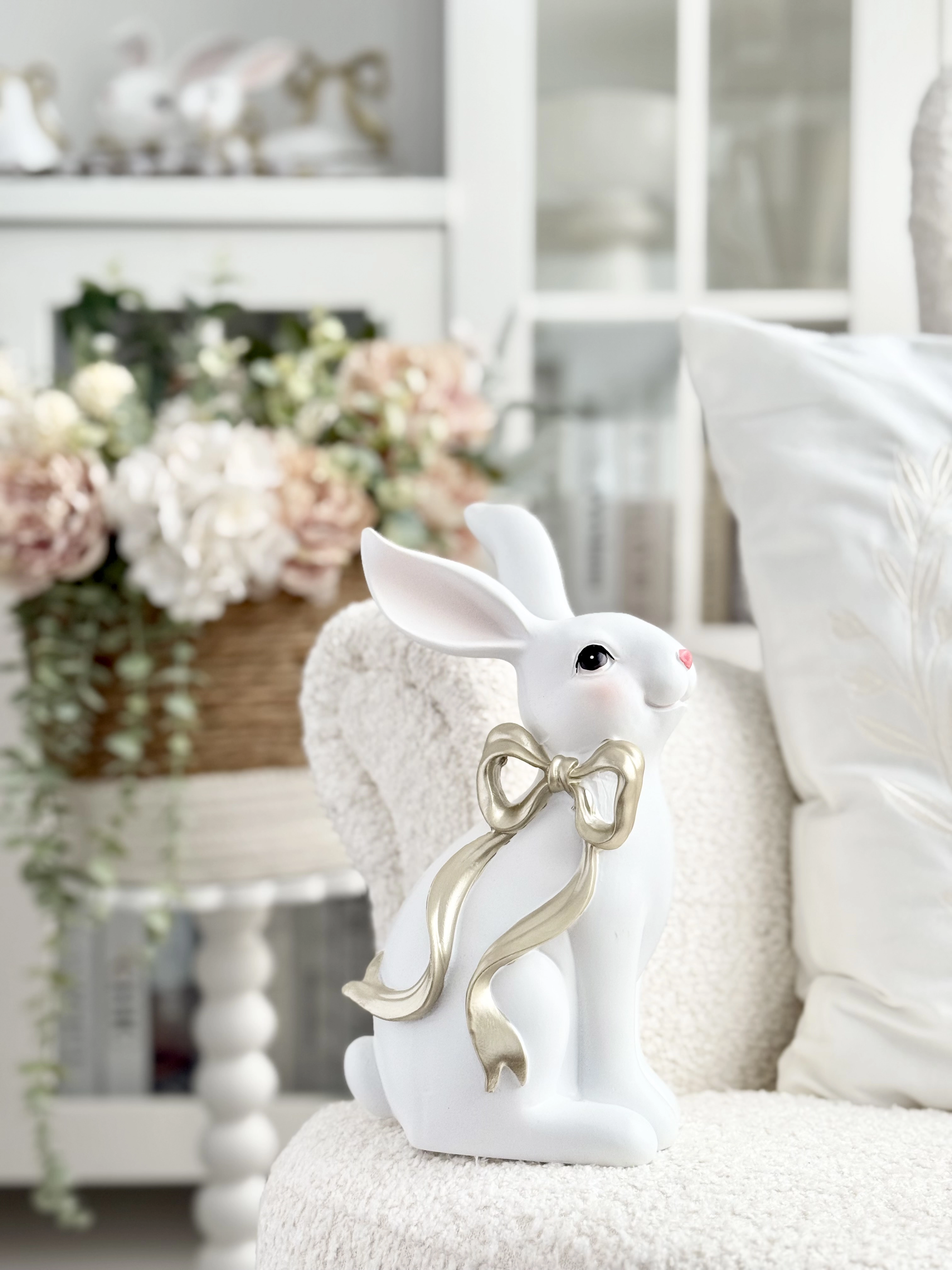 Ozdoba wielkanocna „GOLDEN BOW EASTER”-66 to stylowa dekoracja, która wniesie do wnętrza elegancki, świąteczny akcent. Figurka królika ze złotą kokardą łączy klasyczny motyw wielkanocny z subtelnym, luksusowym detalem, dzięki czemu pięknie prezentuje się w wiosennych aranżacjach.