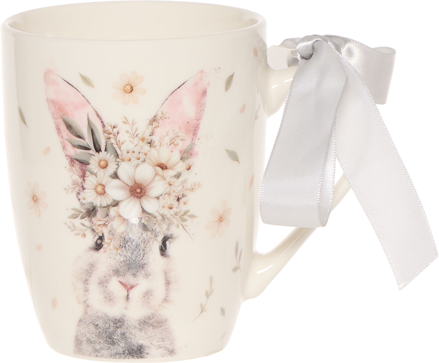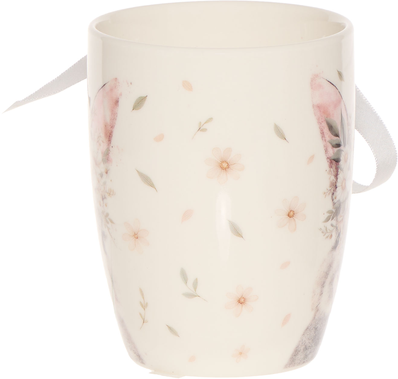 Kubek wielkanocny „EASTER”-171 to uroczy i dekoracyjny dodatek, który idealnie wpisuje się w świąteczny, wiosenny klimat. Utrzymany w białym kolorze, ozdobiony motywem królika oraz subtelną szarą materiałową kokardką, zachwyca delikatnym i eleganckim wykończeniem.