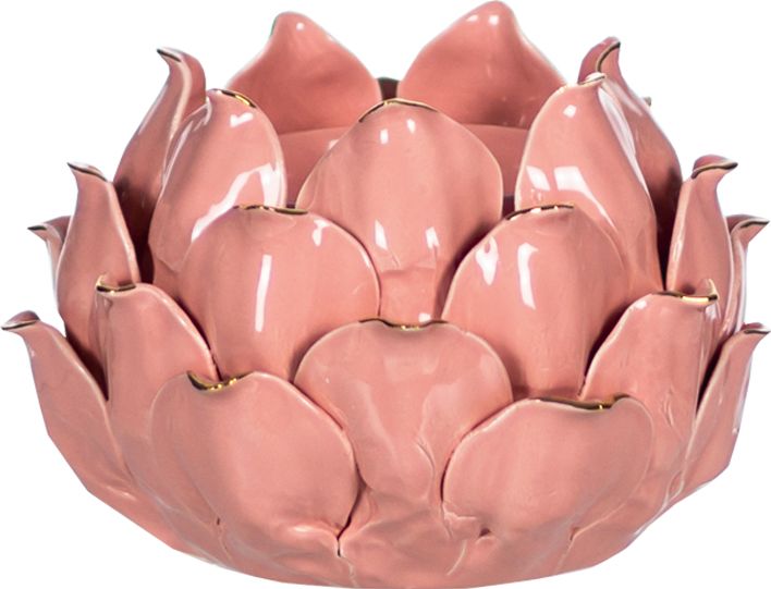 Ceramiczny, ozdobny świecznik w kształcie kwiatu z kolekcji Altigo w kolorze różowym to wyrafinowany dodatek wyposażenia wnętrz. Światło padające poprzez płatki umili każdy wieczór ciesząc oko. Piękny, subtelny motyw kwiatu w całej kolekcji podkreśli wyjątkowość produktu i nada wnętrzom ujmującego uroku. Złote, delikatnie zarysowane wykończenie dopełni całości.