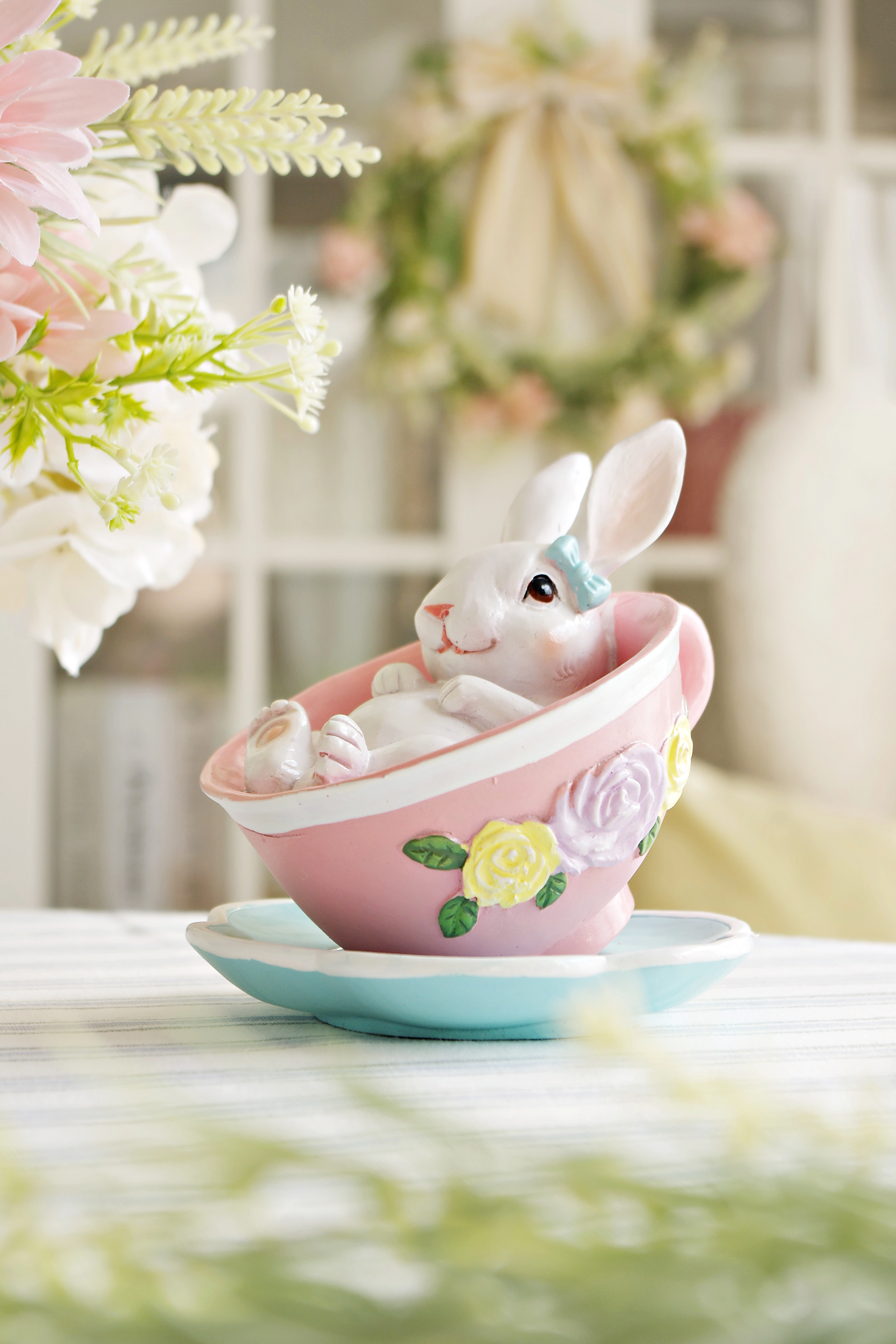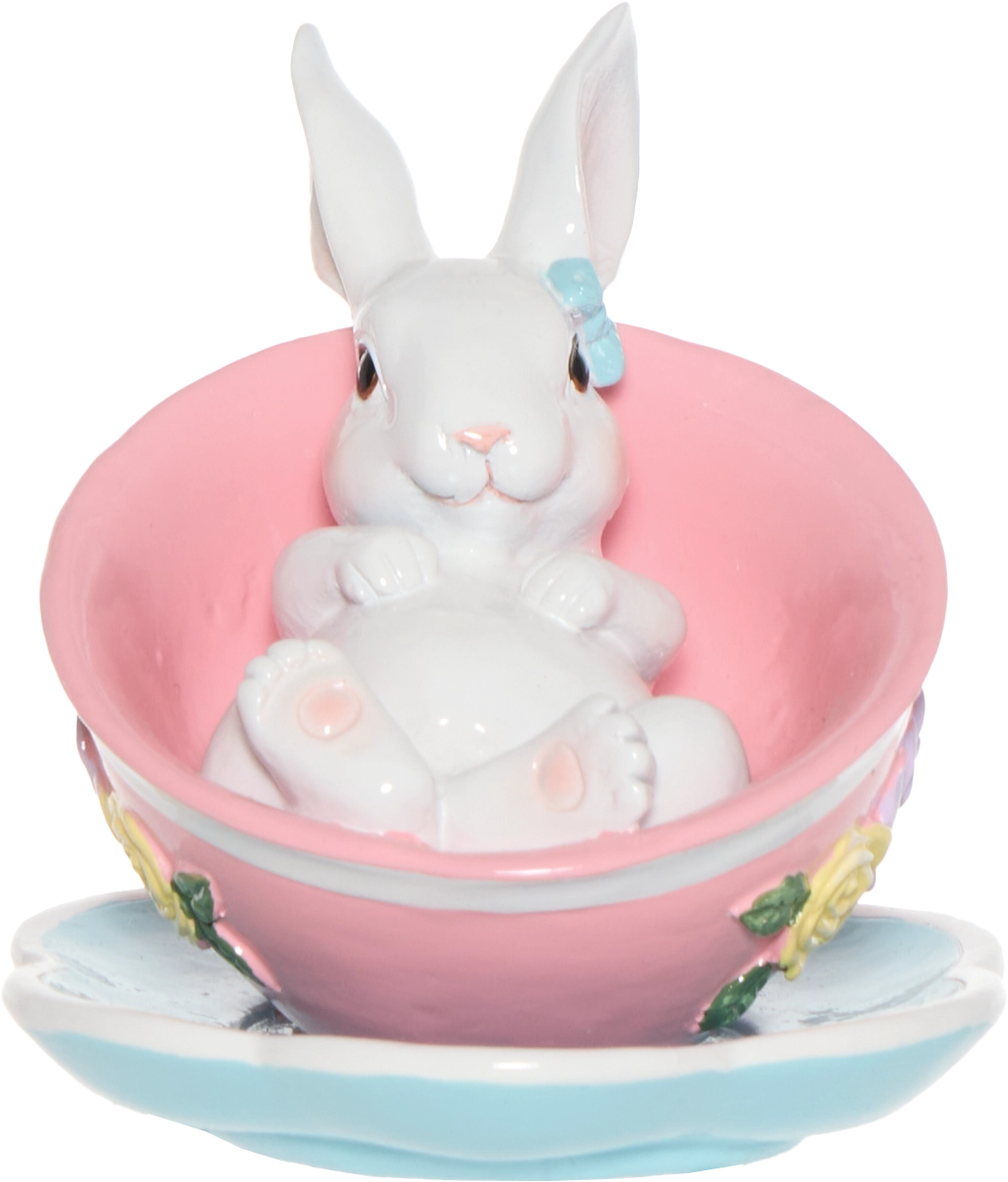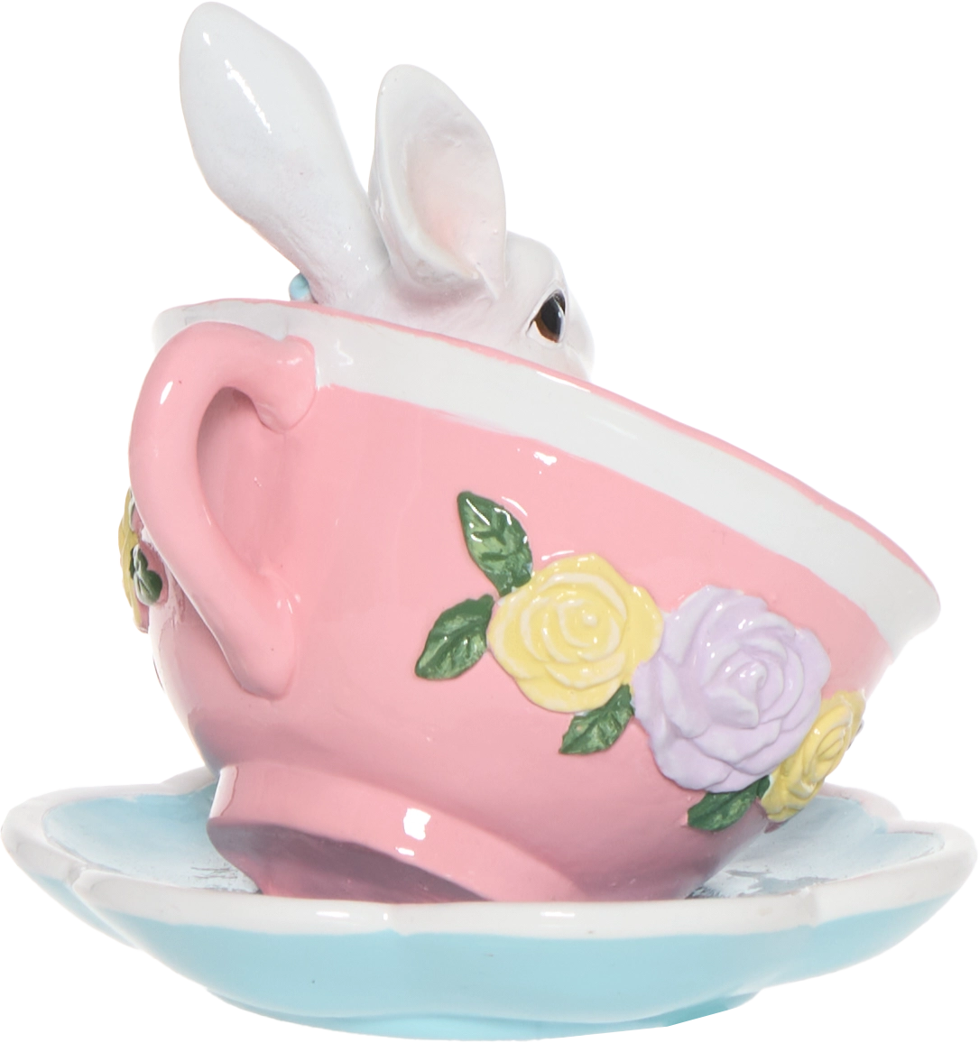 Ozdoba dekoracyjna „ALICE”-109 to urocza i oryginalna dekoracja, która wnosi do wnętrza lekki, bajkowy klimat. Figurka królika w filiżance zachwyca pomysłową formą i starannym wykonaniem, przyciągając wzrok jako wyjątkowy akcent dekoracyjny.