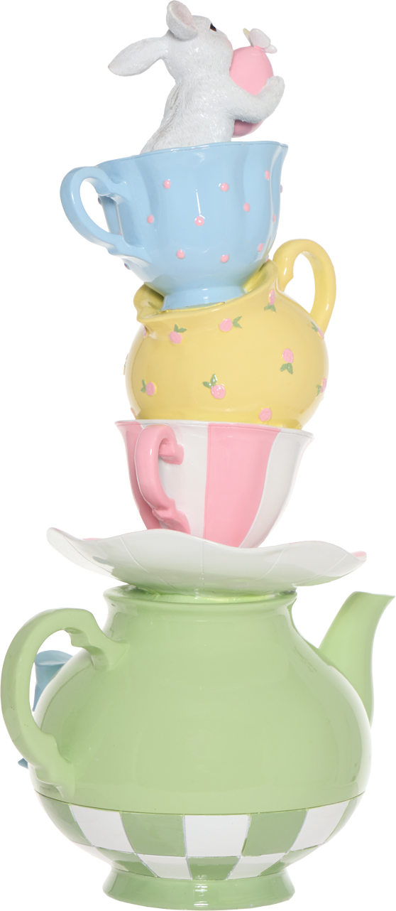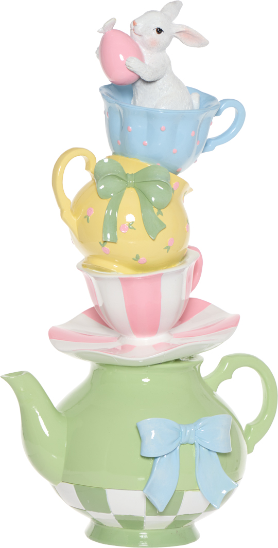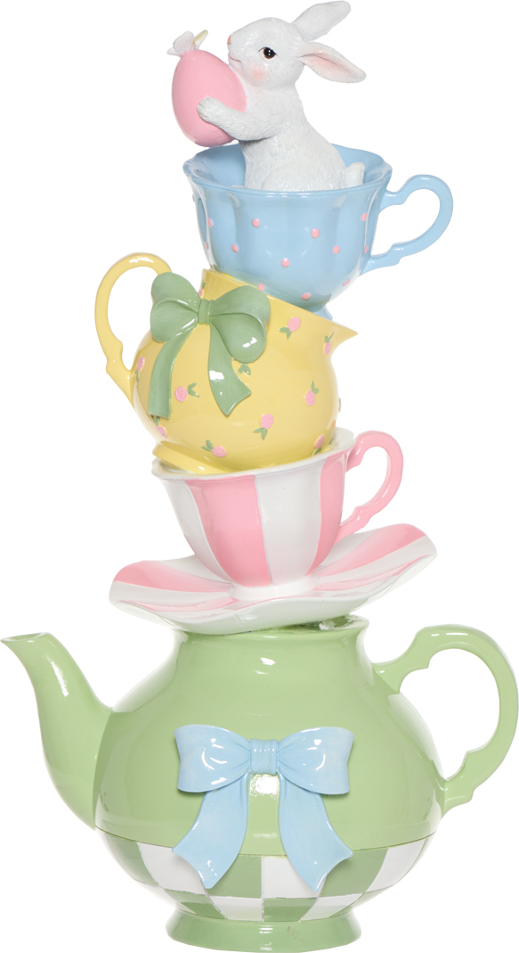 Ozdoba dekoracyjna „ALICE”-113 przedstawiająca królika w filiżance to efektowny element wystroju, który wprowadzi do wnętrza wiosenny, lekko bajkowy klimat. Starannie wykonana figurka zachwyca detalami i doskonale sprawdzi się jako centralny punkt wielkanocnej aranżacji.