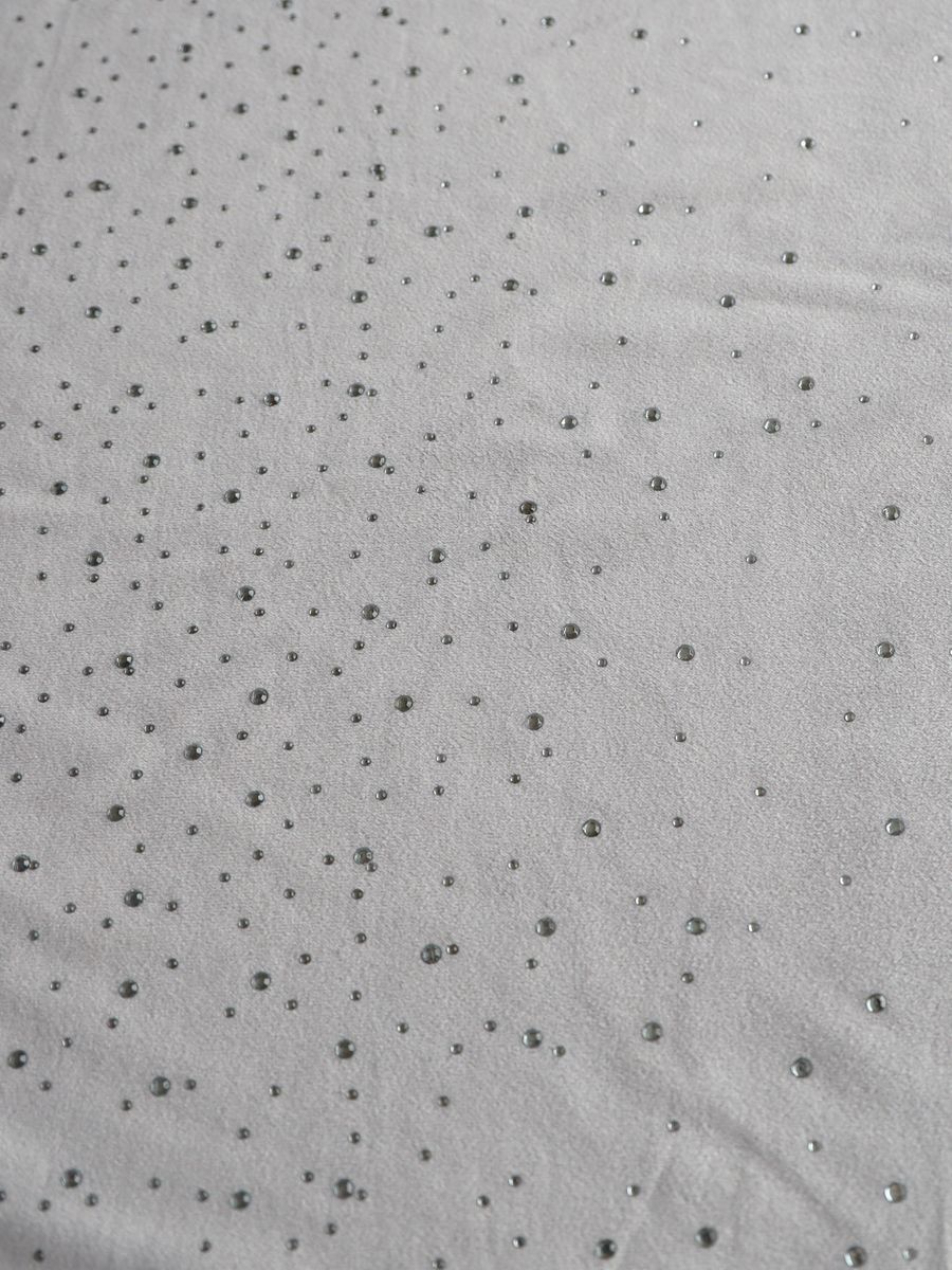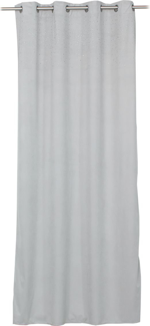 Jest bardzo elegancka, co doda stylizacji okna efekt glamour. Wykonana została z tkaniny welurowej, która zaciemnia pomieszczenie. Charakteryzuje się przyjemną w dotyku strukturą. Ta stylowa i nowoczesna zasłona w górnej części posiada piękne kryształki, które dodają jej wyjątkowego wyglądu i blasku. Mocowana jest na 8 chromowanych srebrnych przelotkach o średnicy 4 cm.