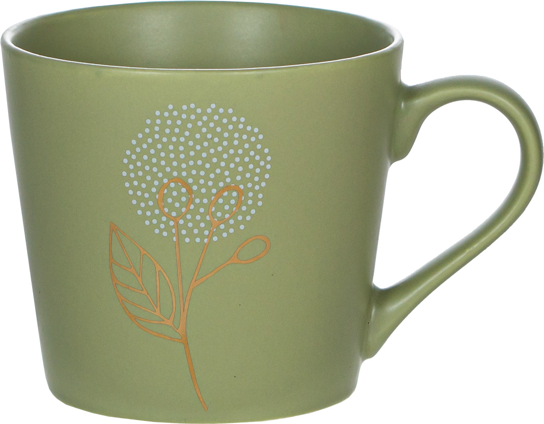 Kubek Botanical w kolorze oliwkowym z złotymi akcentami to elegancki i stylowy dodatek do codziennych napojów. Pojemność 440 ml sprawia, że jest idealny do kawy, herbaty czy innych ulubionych napojów. Subtelne połączenie oliwkowego odcienia i złotych detali nadaje mu naturalny i luksusowy charakter, który doskonale wpasuje się w każdą kuchnię lub biuro.