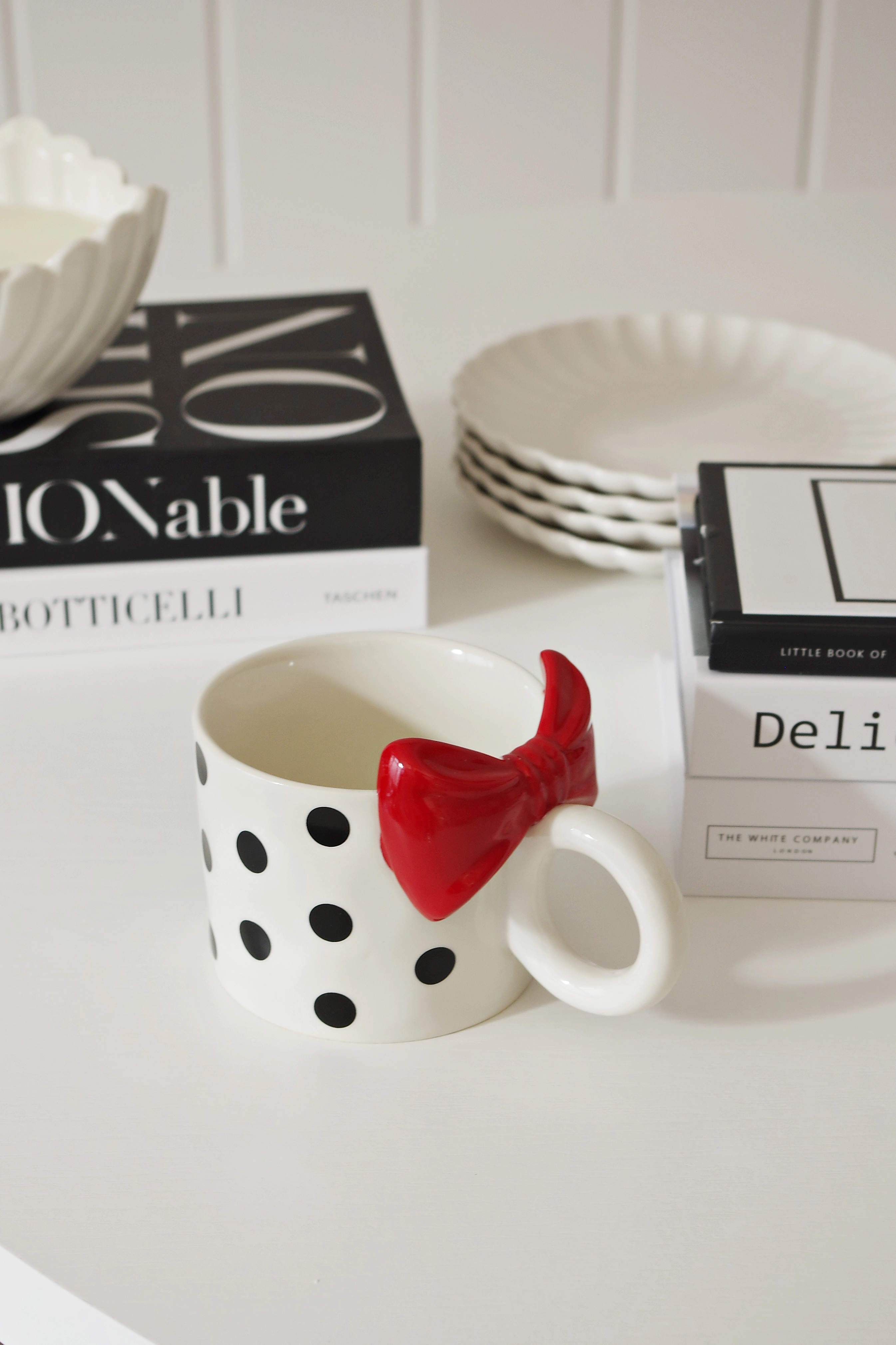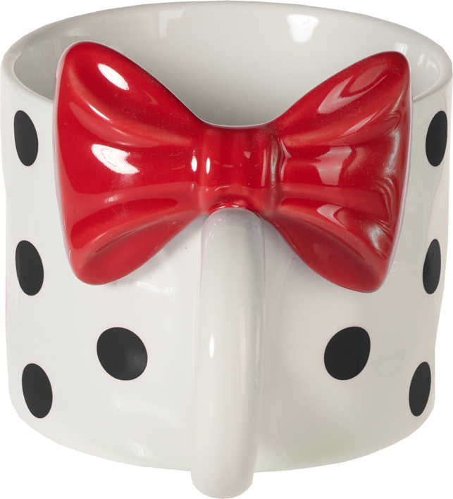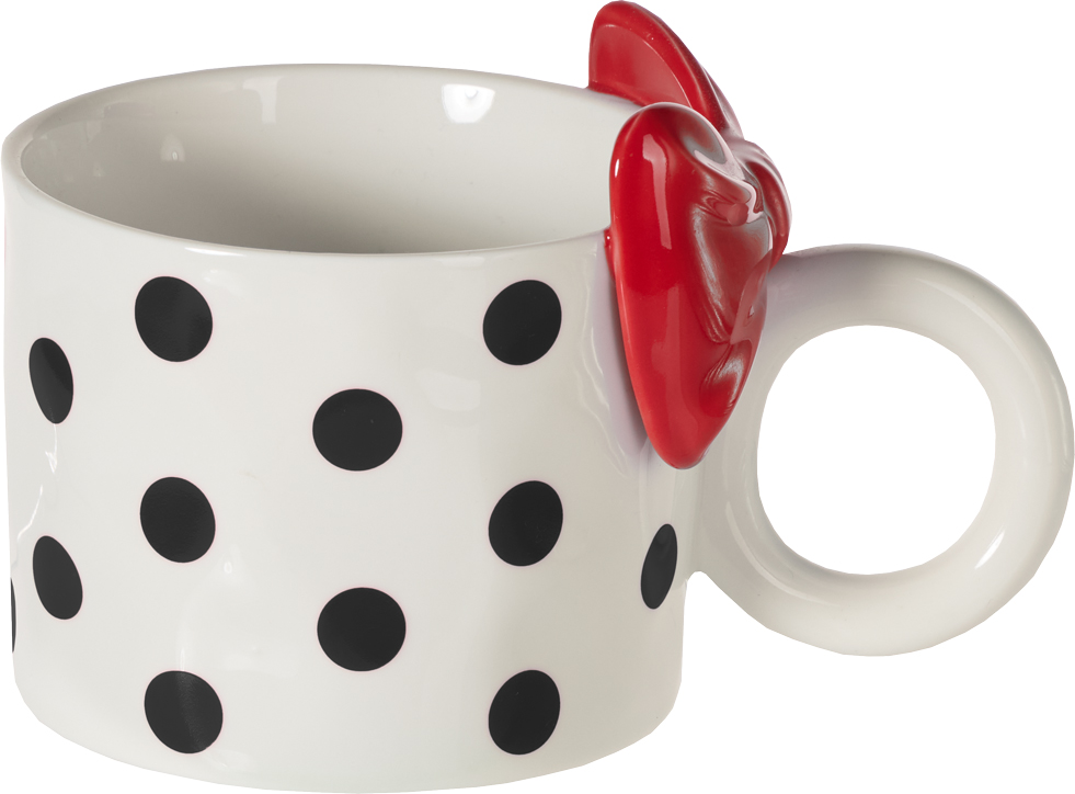 Kubek „BELLA”-169 w kolorze białym w czarne kropki z czerwoną kokardą to wyrazisty i dekoracyjny element zastawy, który przyciąga uwagę oryginalnym wzorem. Połączenie kontrastowych kropek z trójwymiarową, błyszczącą kokardą nadaje mu wyjątkowego, stylowego charakteru.