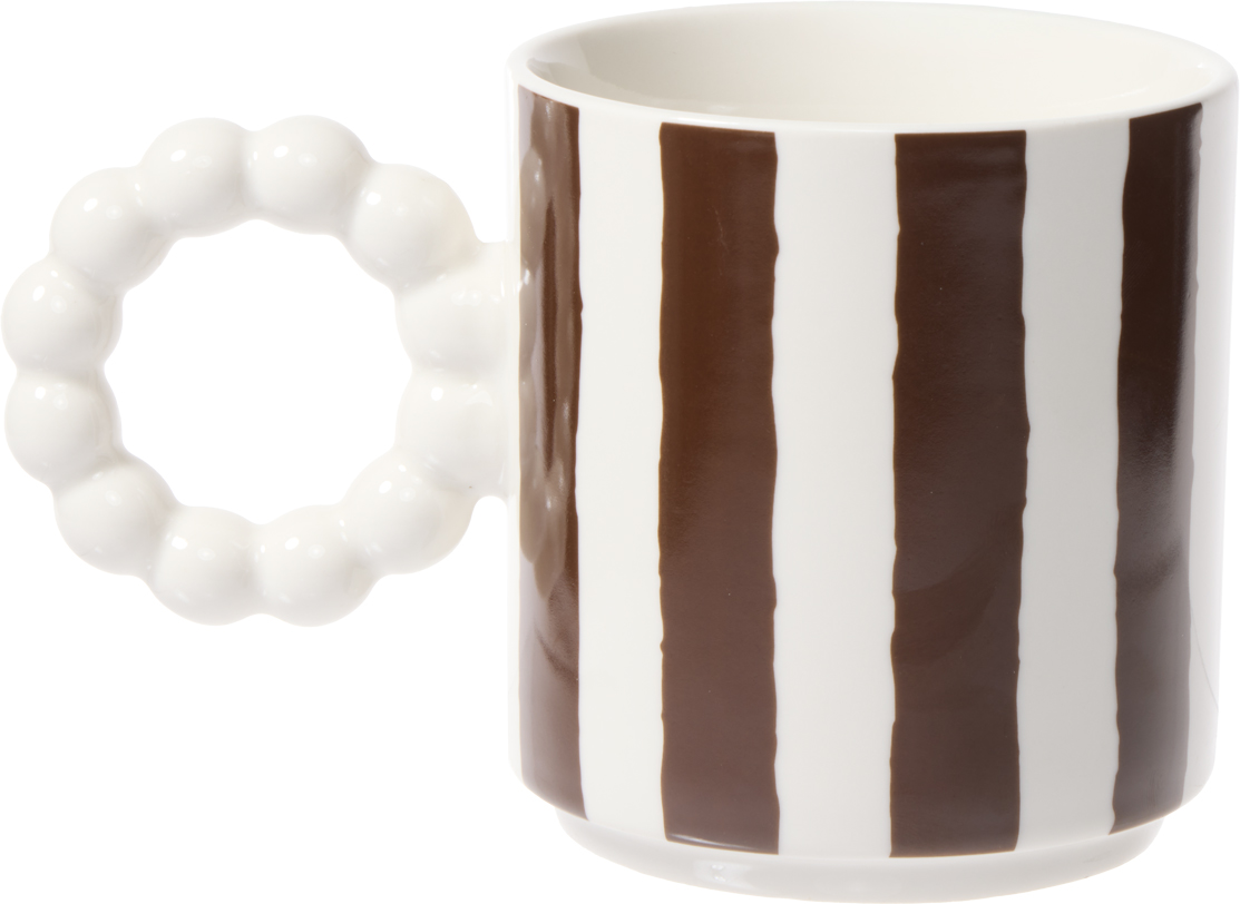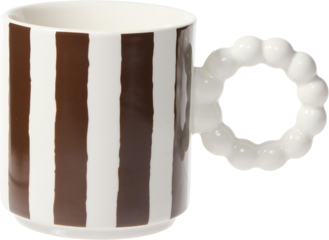 Kubek „RAYAS”-166 w kolorze białym z ciemnobrązowymi paskami to stylowy element zastawy, który wyróżnia się nowoczesnym wzornictwem i oryginalnym detalem. Kontrastowe paski nadają mu eleganckiego charakteru, a ozdobny uchwyt w formie dekoracyjnego pierścienia przyciąga uwagę i podkreśla wyjątkowy design kubka.