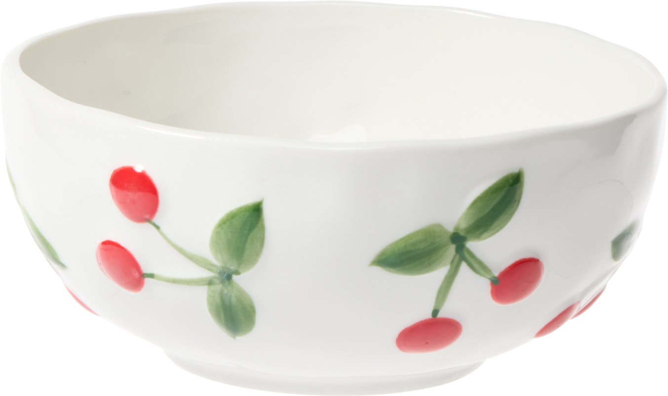 Miseczka „CHERRY”-163 w kolorze białym z motywem wiśni to uroczy element zastawy, który wnosi do stołu lekki, owocowy akcent. Dekoracyjny wzór z czerwonymi wiśniami i zielonymi listkami pięknie kontrastuje z jasnym tłem, tworząc świeżą i pogodną kompozycję.