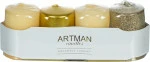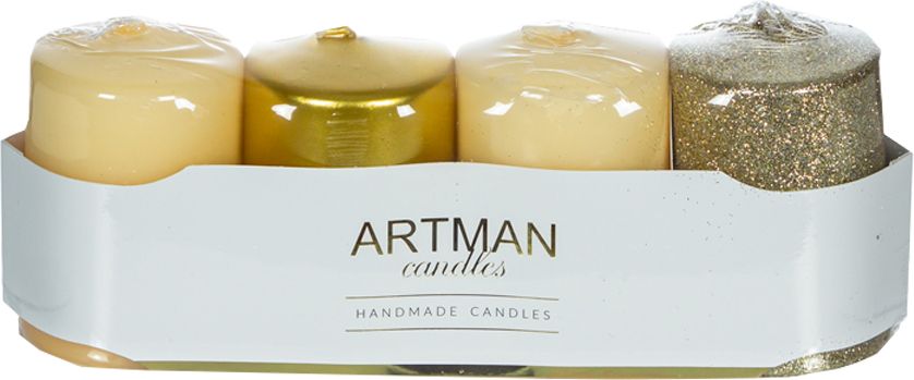 Komplet świec parafinowych w kształcie walca, kolor: kremowy/złoty. W skład zestawu wchodzą 4 sztuki.