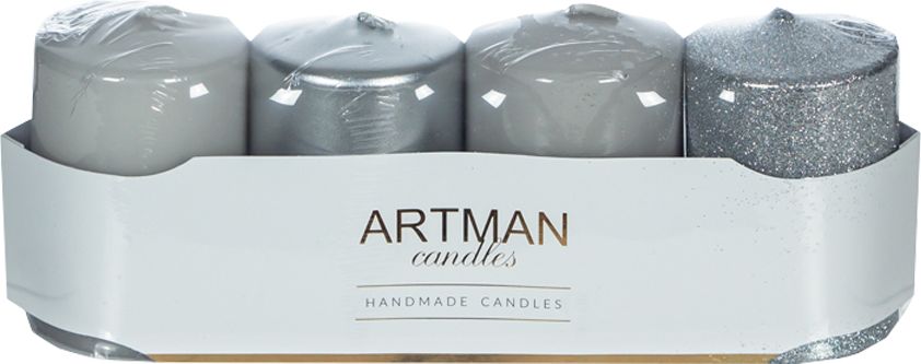 Komplet świec parafinowych w kształcie walca, kolor: szary/srebrny. W skład zestawu wchodzą 4 sztuki.