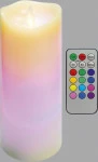 Duża ozdobna świeca woskowa z ruchomym płomieniem zasilana bateryjnie (3xAAA). Baterie nie są dołączone do świecy (możliwy zakup osobno). Świeca sterowana jest zdalnie za pomocą pilota dołączonego do zestawu.