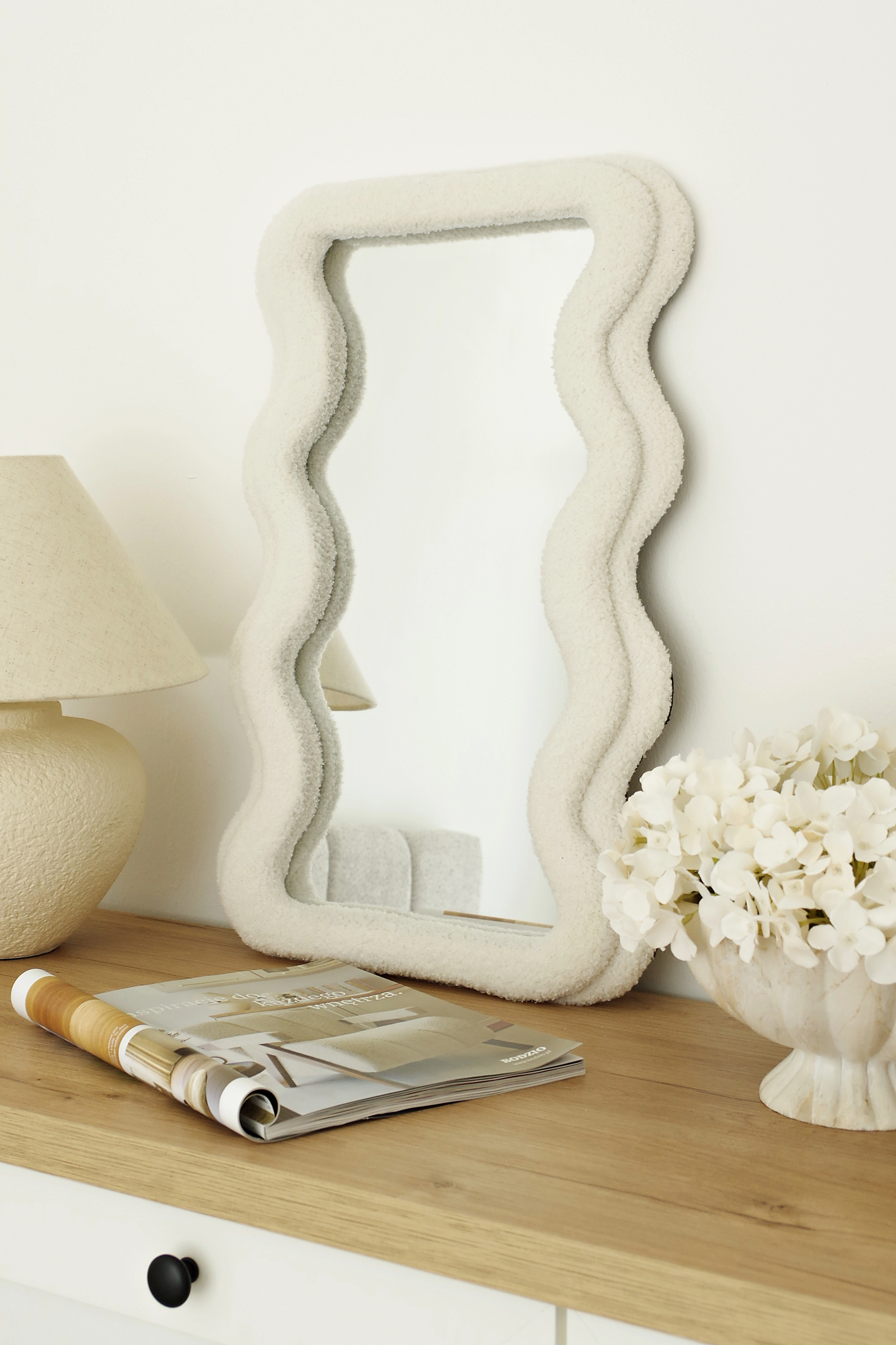 Lustro ścienne Soho z ramą wykonaną z MDF oraz materiału boucle to elegancka dekoracja, która wprowadzi nowoczesny akcent do Twojego wnętrza. Wymiary 35 x 3,5 x 60 cm sprawiają, że jest to lustro idealne do przedpokoju, sypialni lub salonu. Rama z materiału boucle nadaje mu subtelny, teksturalny wygląd, który świetnie komponuje się z nowoczesnymi oraz klasycznymi aranżacjami, dodając przestrzeni elegancji i stylu.
