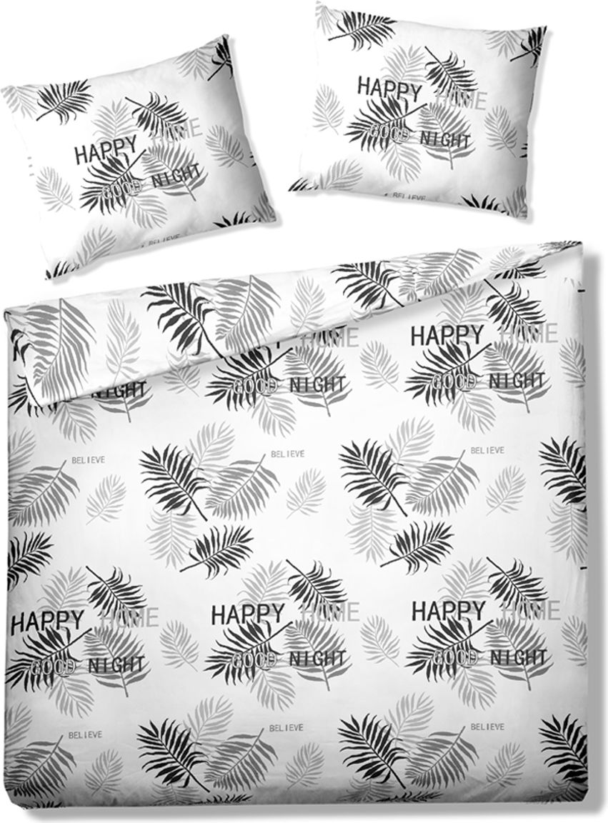 Zestaw pościeli z kolekcji Black Leaves z dekoracyjnym wzorem, w skład którego wchodzą 2 poduszki i kołdra. Wymiar poszewki na kołdrę wynosi 160 x 200 cm, natomiast na poduszki 70 x 80 cm.