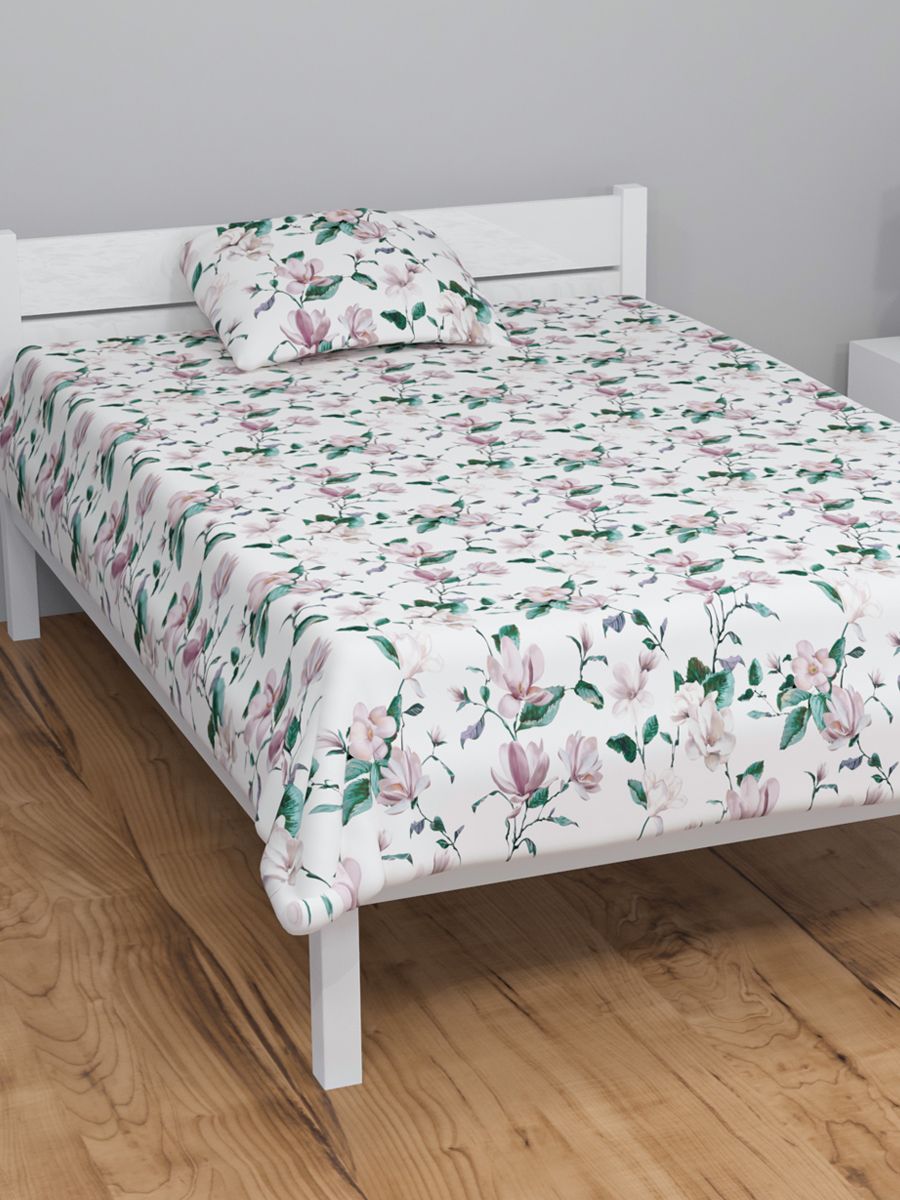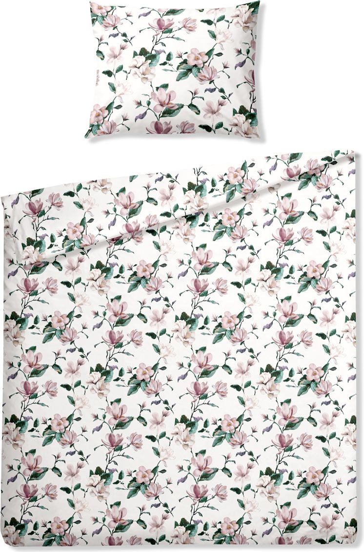 Zestaw pościeli z kolekcji Fiores z dekoracyjnym, kwiatowym wzorem, w skład którego wchodzi jedna poszewka na poduszkę (70x80cm) i poszewka na kołdrę. Wymiar poszewki na kołdrę wynosi 140 x 200 cm.