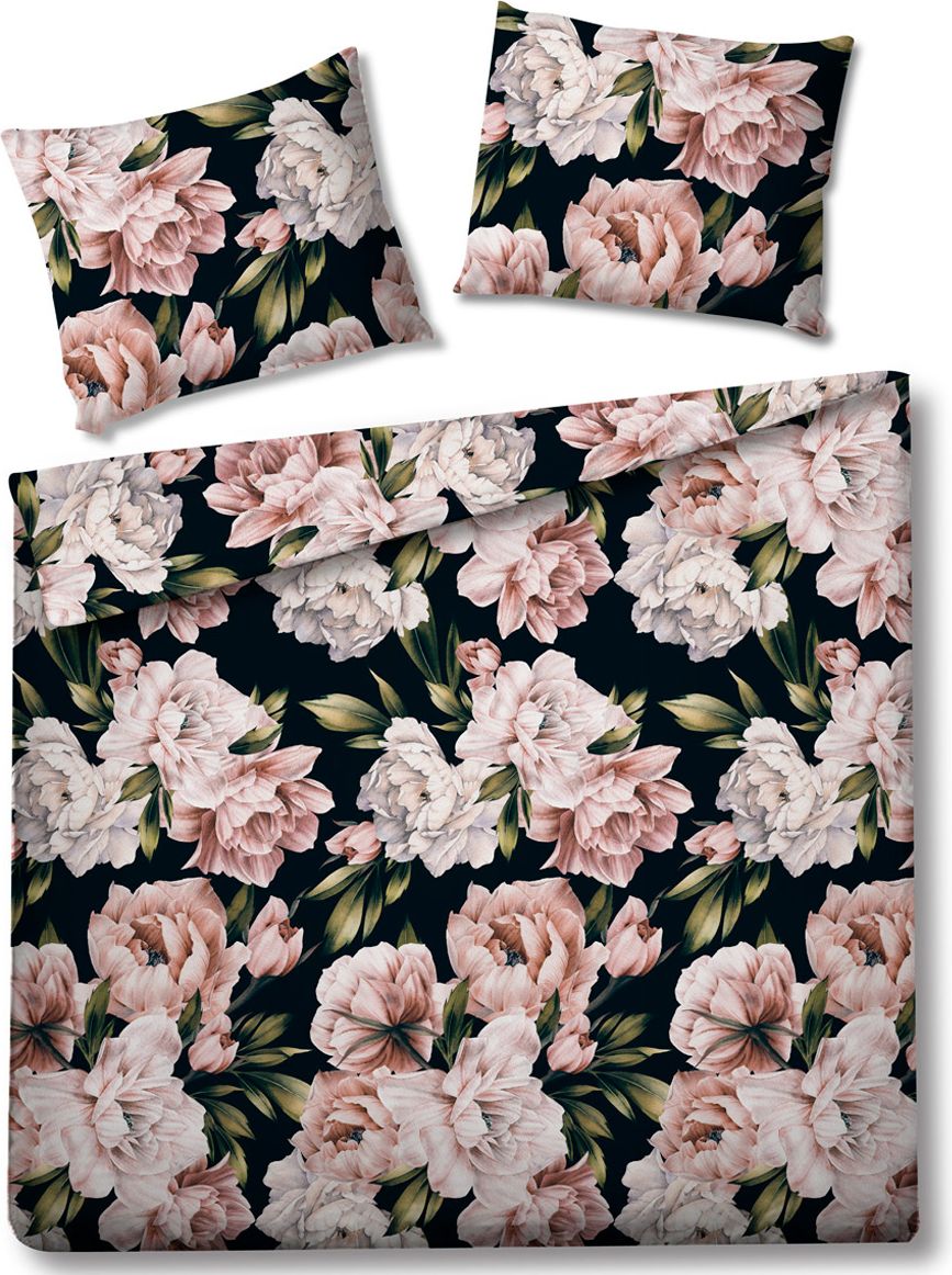 Zestaw pościeli z kolekcji PEONY z dekoracyjnym, kwiatowym wzorem, w skład którego wchodzą dwie poszewki na poduszkę (70x80cm) i poszewka na kołdrę. Wymiar poszewki na kołdrę wynosi 200 x 220 cm.