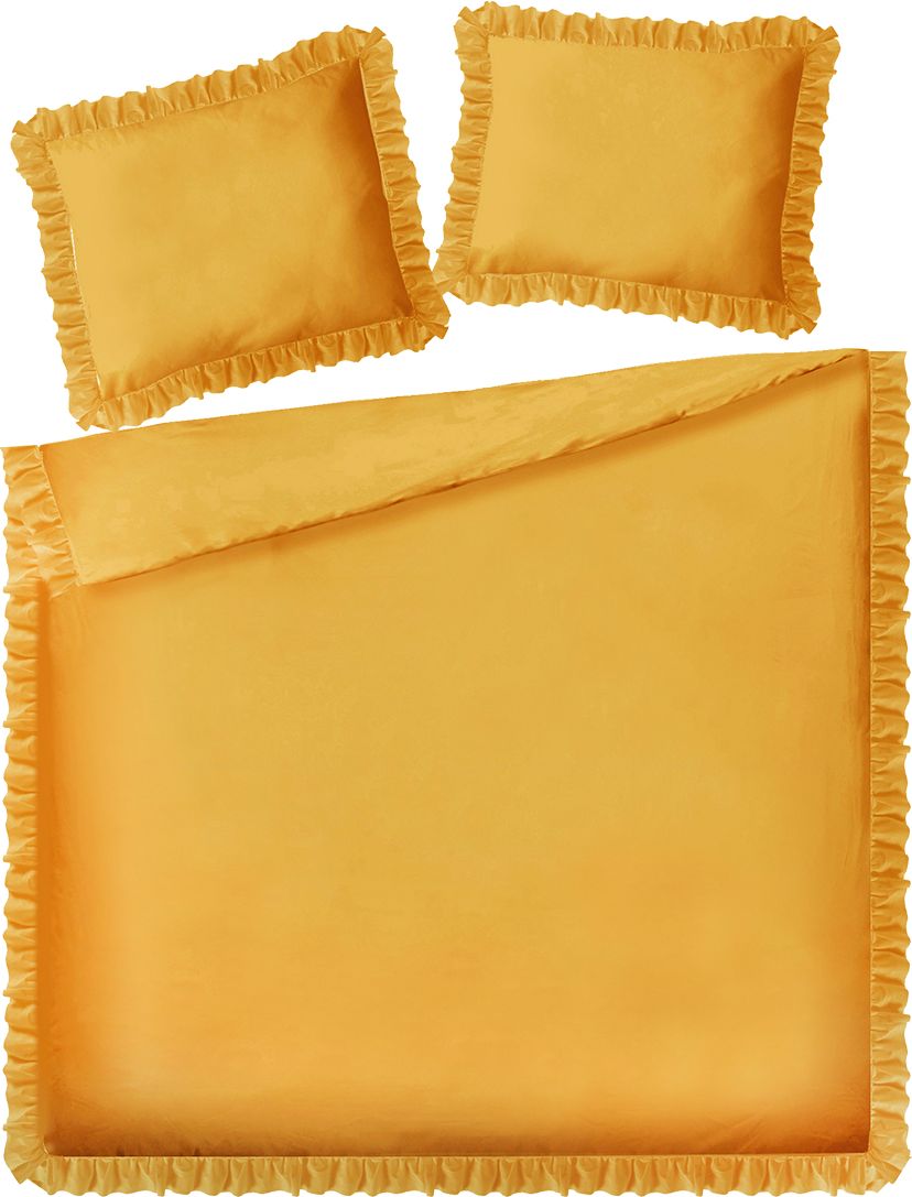 Zestaw pościeli z kolekcji FLAMENCO w kolorze miodowym z dekoracyjną falbanką, w skład którego wchodzą dwie poszewki na poduszkę (70x80cm) i poszewka na kołdrę. Wymiar poszewki na kołdrę wynosi 160 x 200 cm.