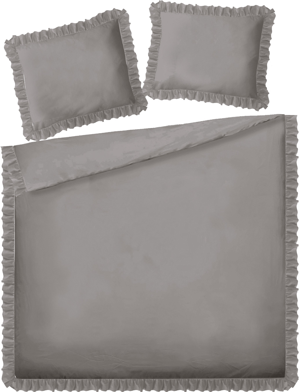 Zestaw pościeli z kolekcji FLAMENCO w kolorze szarym z dekoracyjną falbanką, w skład którego wchodzą dwie poszewki na poduszkę (70x80cm) i poszewka na kołdrę. Wymiar poszewki na kołdrę wynosi 160 x 200 cm.
