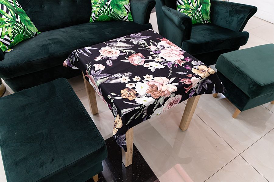 Czarny obrus Fiorento w kwiaty idealnie dopełni wygląd każdego pomieszczenia.