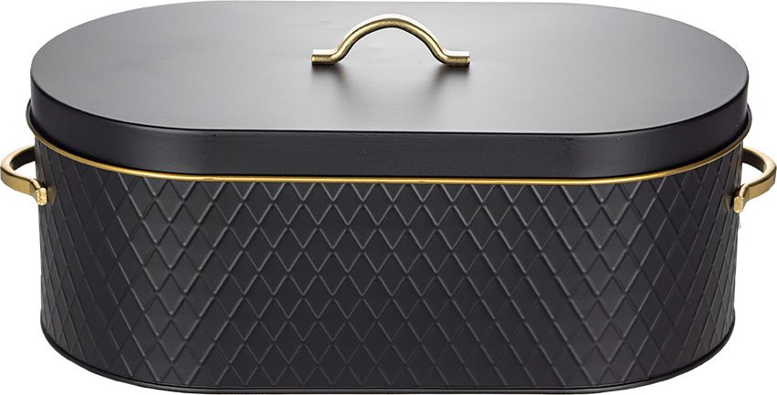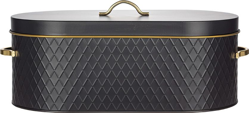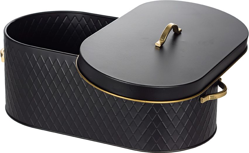 Czarny chlebak Sandy z pokrywką w tym samym kolorze, zdobiony złotymi akcentami, to elegancki i funkcjonalny pojemnik na chleb. Jego nowoczesny design i subtelne złote detale wprowadzają luksusowy akcent do każdej kuchni, a solidna konstrukcja zapewnia praktyczne przechowywanie chleba i innych pieczyw.