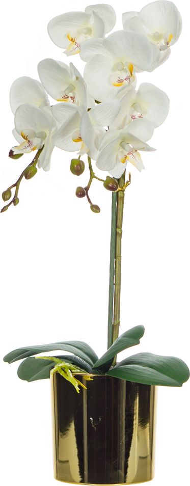 Realistycznie wyglądający sztuczny kwiat ozdobny z kolekcji LAVIO w złotej donicy, został wykonany z wysokiej jakości materiałów imitujących wygląd prawdziwej rośliny.