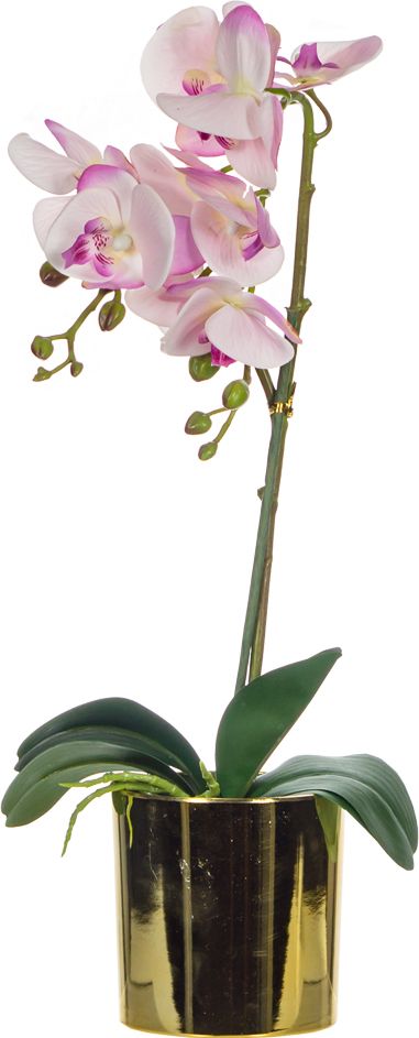 Realistycznie wyglądający sztuczny kwiat ozdobny z kolekcji LAVIO w złotej donicy, został wykonany z wysokiej jakości materiałów imitujących wygląd prawdziwej rośliny.