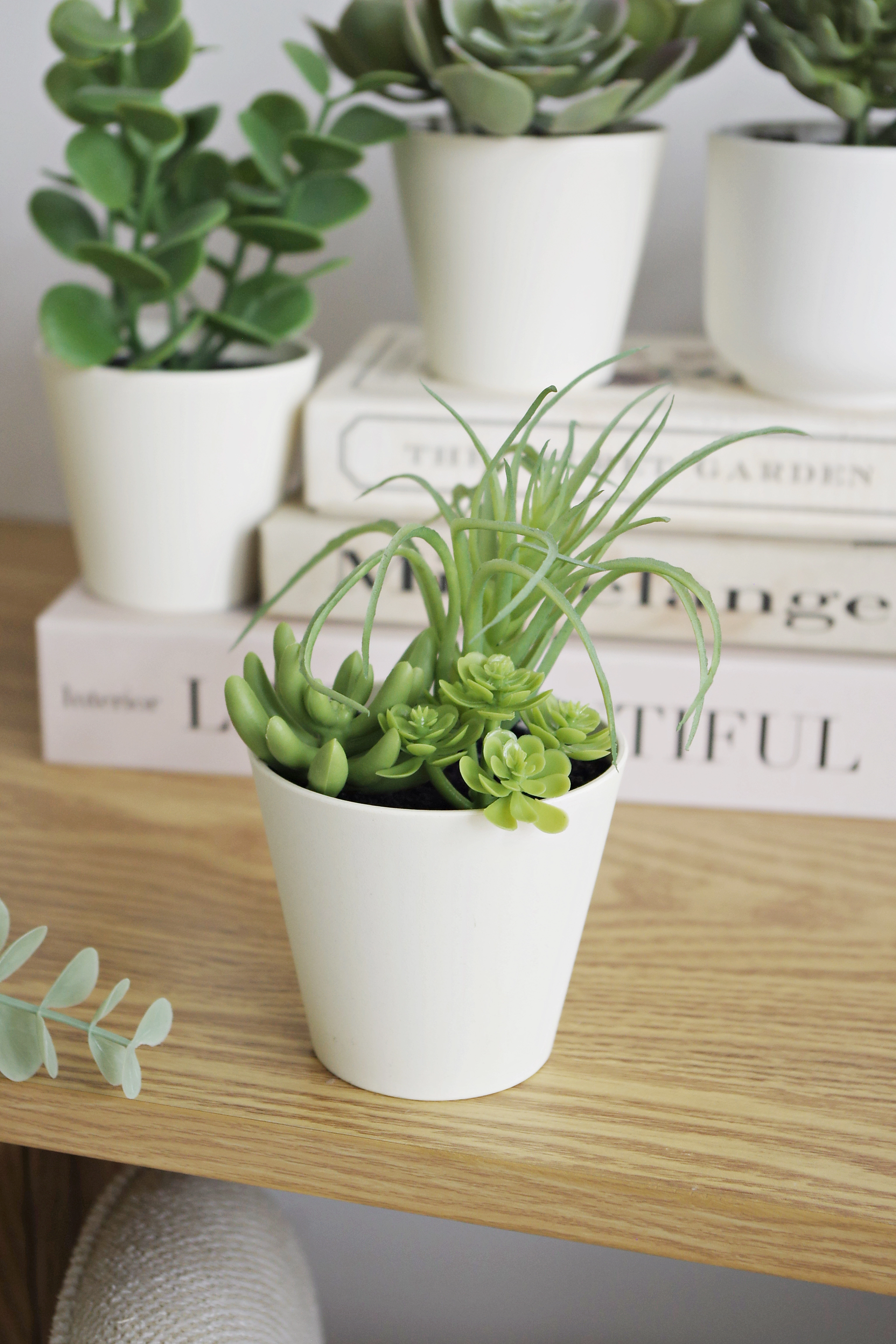 Sztuczna roślina sukulent "FLORINO"-141 w plastikowej białej doniczce to elegancki i kompaktowy element dekoracyjny. Jej wysokość wynosi 14 cm, co sprawia, że doskonale prezentuje się na biurku, półce lub stoliku. Realistycznie odwzorowane liście nadają wnętrzu świeżości i naturalnego uroku, a prosta biała doniczka dodaje lekkości i nowoczesnego charakteru. Idealna do aranżacji w stylu minimalistycznym, skandynawskim i klasycznym, bez potrzeby pielęgnacji.