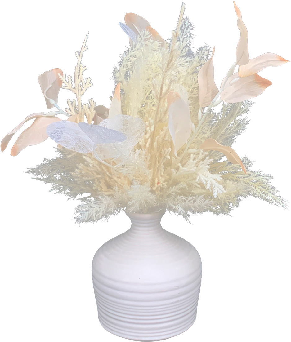 Sztuczna kompozycja z gałązek i traw "FLORINO"-150 w ceramicznym wazonie to elegancka i naturalnie wyglądająca dekoracja wnętrza. Jej wymiary wynoszą 15 cm szerokości, 15 cm głębokości i 40 cm wysokości, dzięki czemu doskonale prezentuje się na stole, komodzie lub półce. Połączenie subtelnych traw i delikatnych gałązek tworzy harmonijną kompozycję, która nadaje wnętrzu lekkości i przytulnego charakteru. Idealna do nowoczesnych i klasycznych aranżacji, nie wymaga pielęgnacji i zawsze wygląda świeżo.