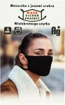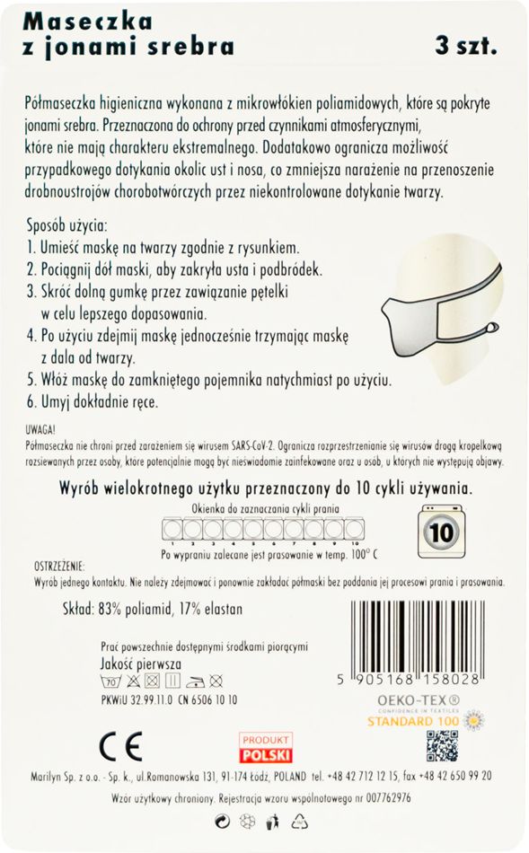 Maseczka higieniczna wykonana z mikrowłókien poliamidowych, które są pokryte jonami srebra.Wyrób wielokrotnego użytku.