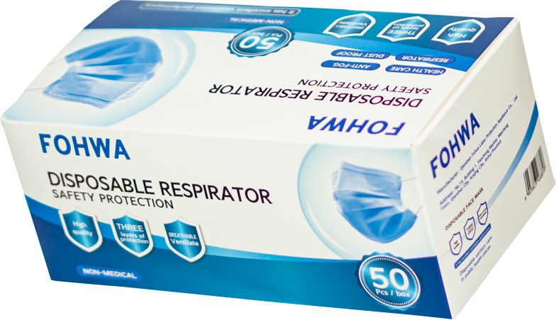 Maseczki ochronne zasłaniające nos i usta, jednorazowe, pakowane w kartonikach po 50 sztuk.