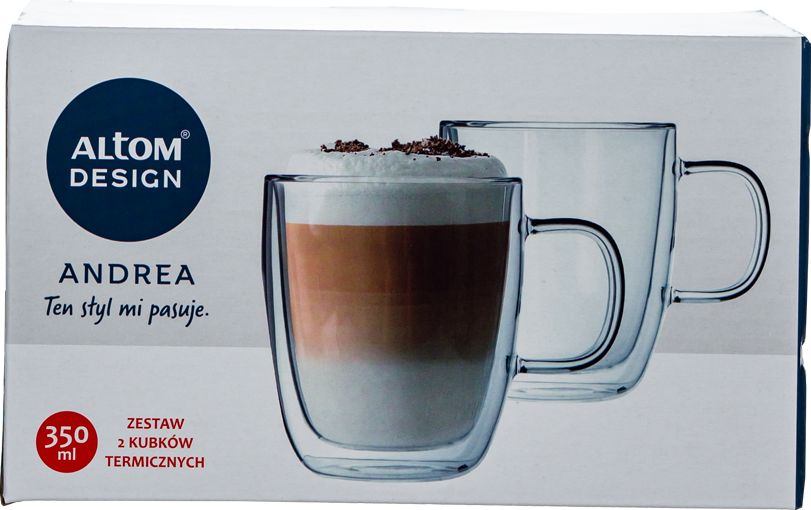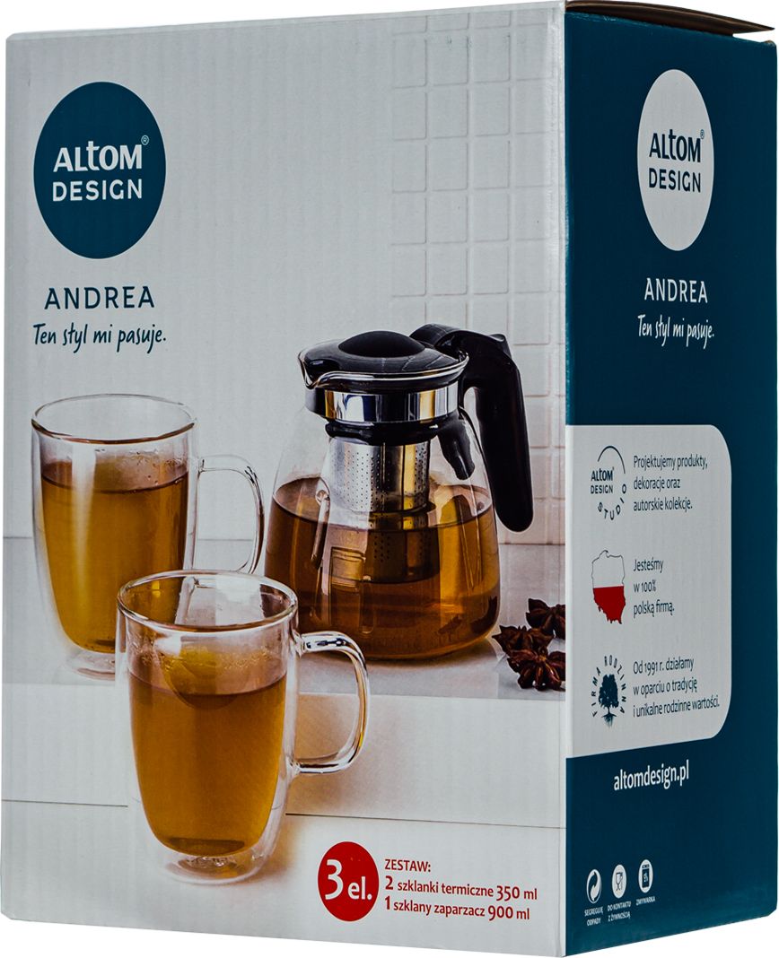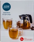 3 elementowy zestaw ANDREA składający się z 2 szklanek termicznych o pojemności 350ml oraz dzbanka szklanego z zaparzaczem o pojemności 900ml.