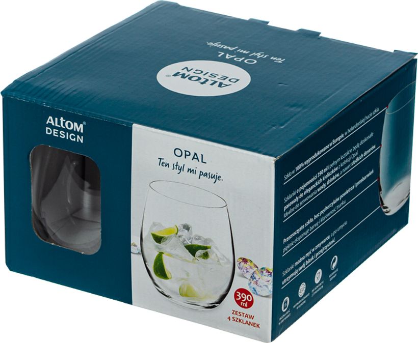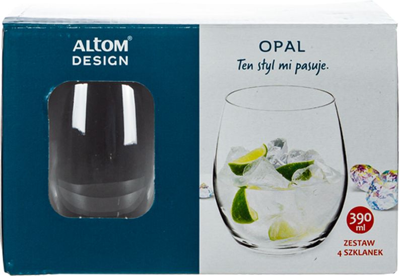 Szklanki o pojemności 390 ml i pełnym kształcie będą doskonale pasowałydo eleganckich kieliszków z kolekcji Opal. Idealne do serwowania wody, drinków, a nawet słodkich deserów.