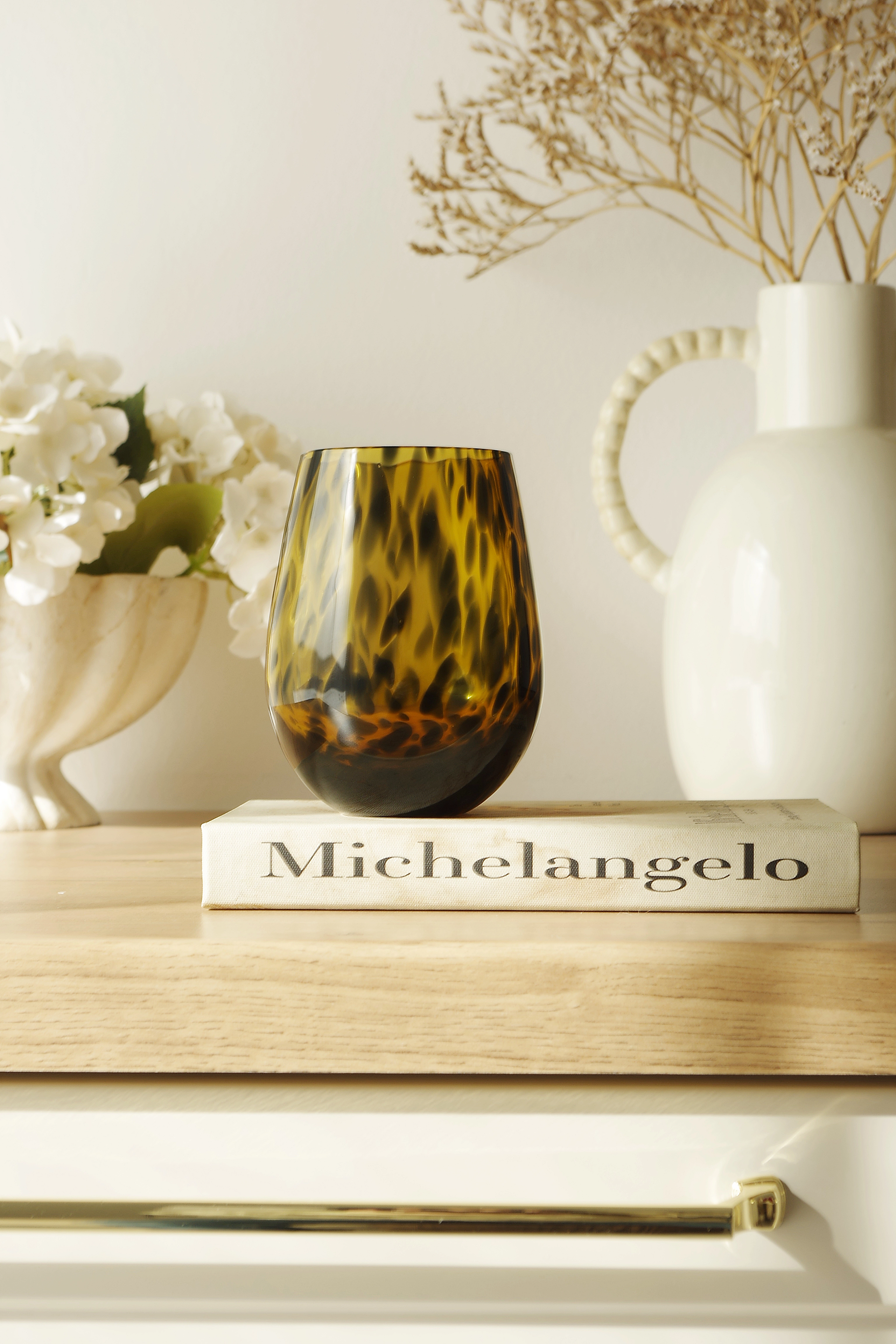 Szklanka „DOTS”-24 to elegancki i nowoczesny dodatek do zastawy stołowej. Wykonana z bursztynowego szkła zdobionego czarnymi kropkami, przyciąga wzrok swoim niebanalnym wyglądem i wprowadza do wnętrza ciepły, stylowy akcent. Pojemność 550 ml sprawia, że doskonale nadaje się do serwowania ulubionych napojów każdego dnia. Solidne wykonanie gwarantuje wygodę użytkowania i trwałość, a unikalny wzór podkreśla charakter stołu. Szklanka DOTS łączy funkcjonalność z dekoracyjnym designem – idealna dla osób ceniących oryginalne i estetyczne dodatki.