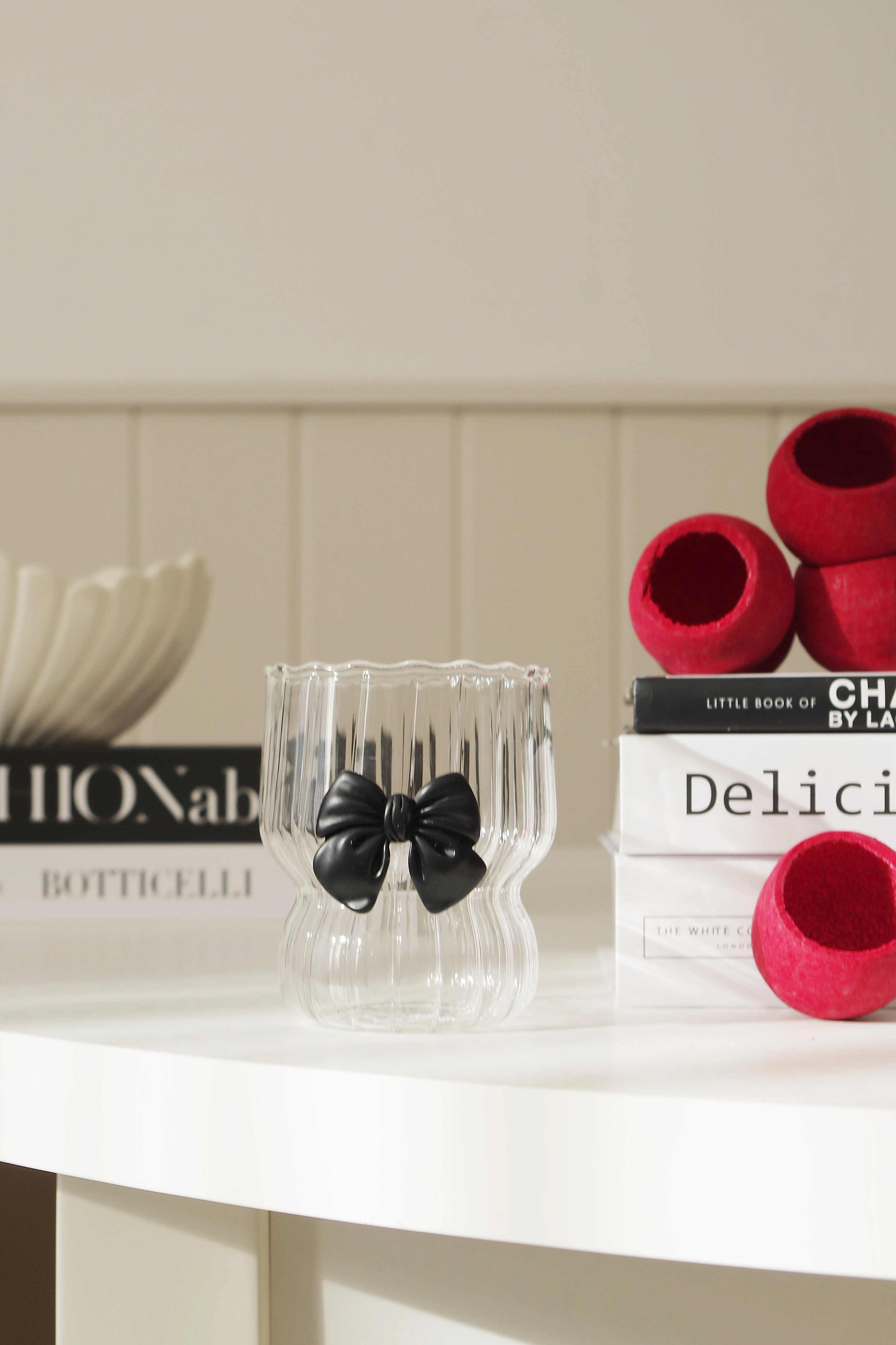 Szklanka ryflowana „BELLA”-33 to elegancki element zastawy stołowej, który wyróżnia się dekoracyjną czarną kokardką, nadającą jej nowoczesnego i wyrafinowanego charakteru. Ryflowana struktura szkła podkreśla estetykę i sprawia, że szklanka prezentuje się wyjątkowo stylowo.
