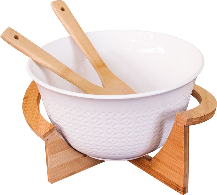 Ceramiczna misa Palomo w kolorze białym wraz z drewnianymi łyżkami oraz dopasowaną podstawką.