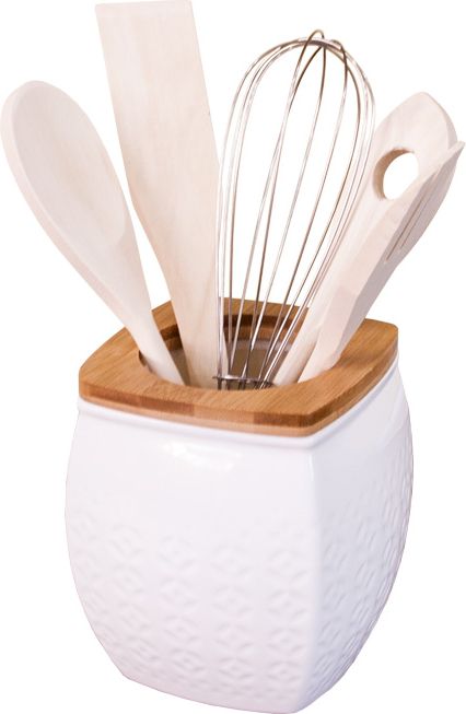 Drewniane akcesoria (łyżka, szpatułka, widelec, ubijaczka) w zestawie z ceramicznym pojemnikiem w kolorze białym Palomo.